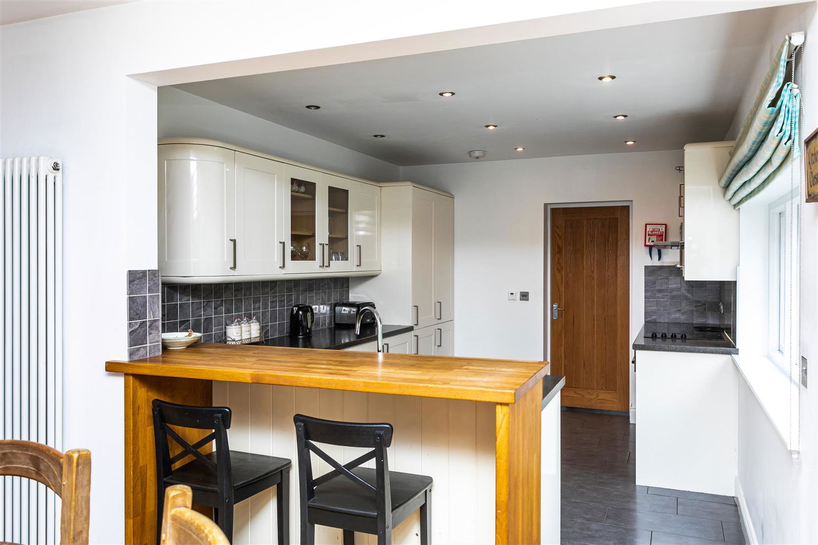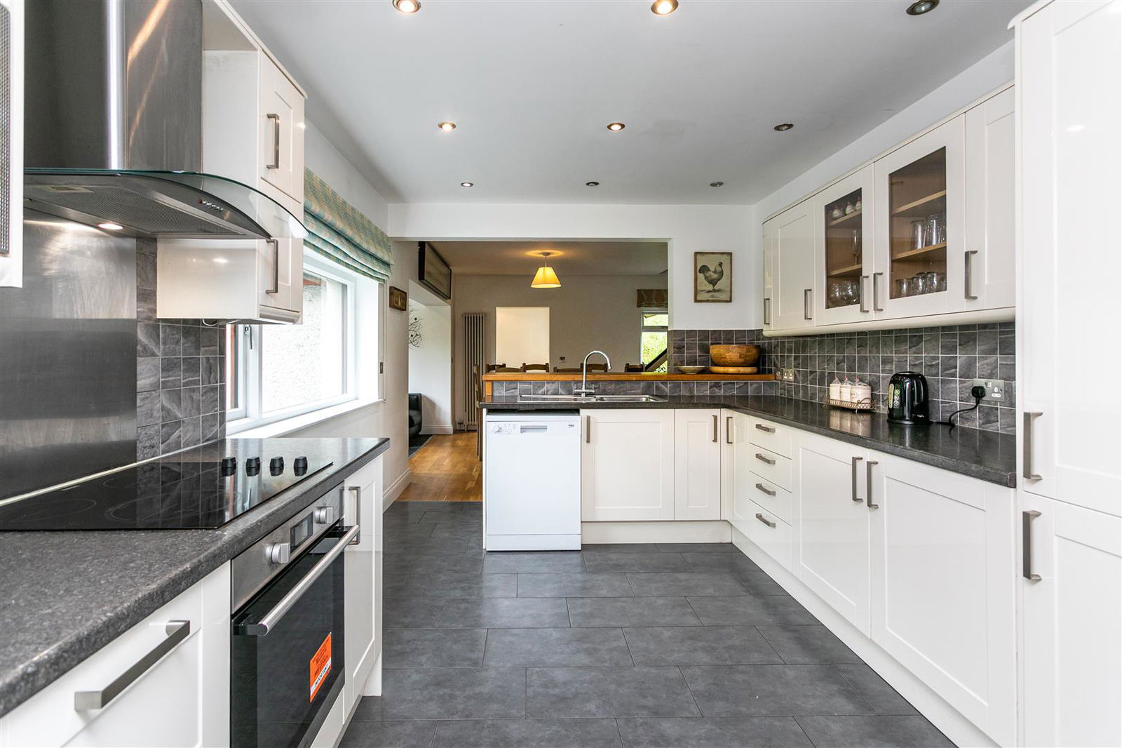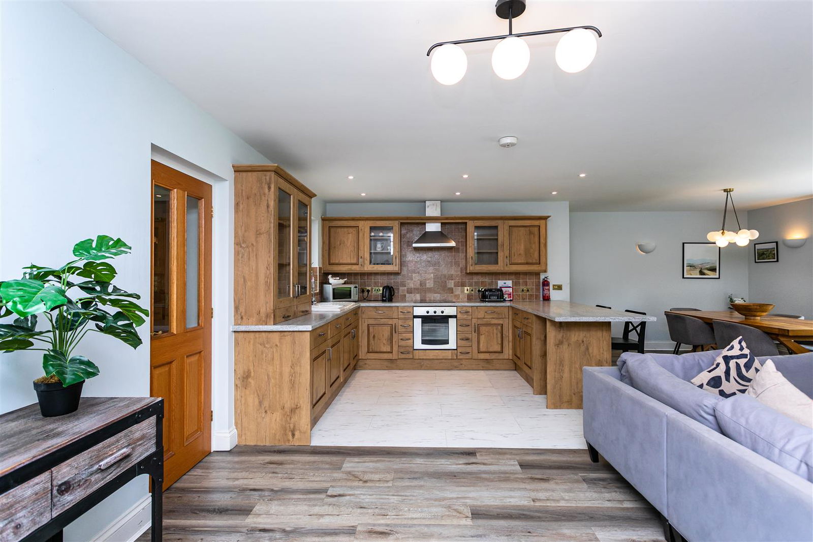 The entrance is straight into the central dining hall, with wood strip flooring and an open riser staircase it is an attractive approach. The kitchen is open plan and separated from the dining hall by a high oak breakfast bar. Sleek and stylish, the cabinets are fitted with cream high gloss doors. Integral appliances comprise a Hotpoint electric oven under a Zanussi hob with extractor fan over, Kenwood fridge freezer, Whirlpool microwave and a freestanding Beko dishwasher. The utility room provides a useful back up and provides a wet weather entrance with a door in from the rear porch. A freezer, washing machine and tumble dryer (all Beko) are here as well as the Vaillant central heating boiler and hot water storage tank.