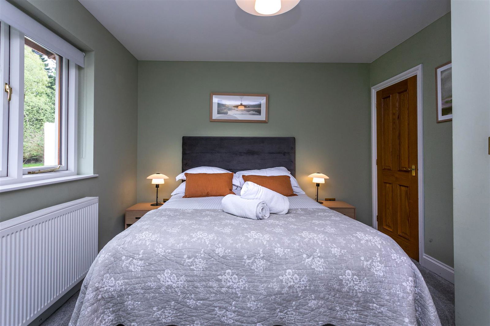 The front door is recessed providing a degree of shelter, the door opening to a hall of which is a passageway where you’ll find the bedroom accommodation. The open plan living kitchen is a lovely large room with picture windows to three sides giving good views of the garden and trees beyond. French windows open during warmer months to the paved seating areas and for the colder months there is a Morso Squirrel wood burning stove in a painted wooden surround. The oak fronted kitchen units echo the natural environment outside, there is a breakfast bar but also plenty of space for a table too. Internal appliances comprise an Indesit electric oven, a Schott Ceran hob, extractor fan, Beko dishwasher and Essentials fridge. The utility room houses a Zanussi washing machine as well as a freezer and second fridge and with a stable door to outside it makes a good place for coats and boots. Off here is a boiler room with a downstairs cloakroom too.