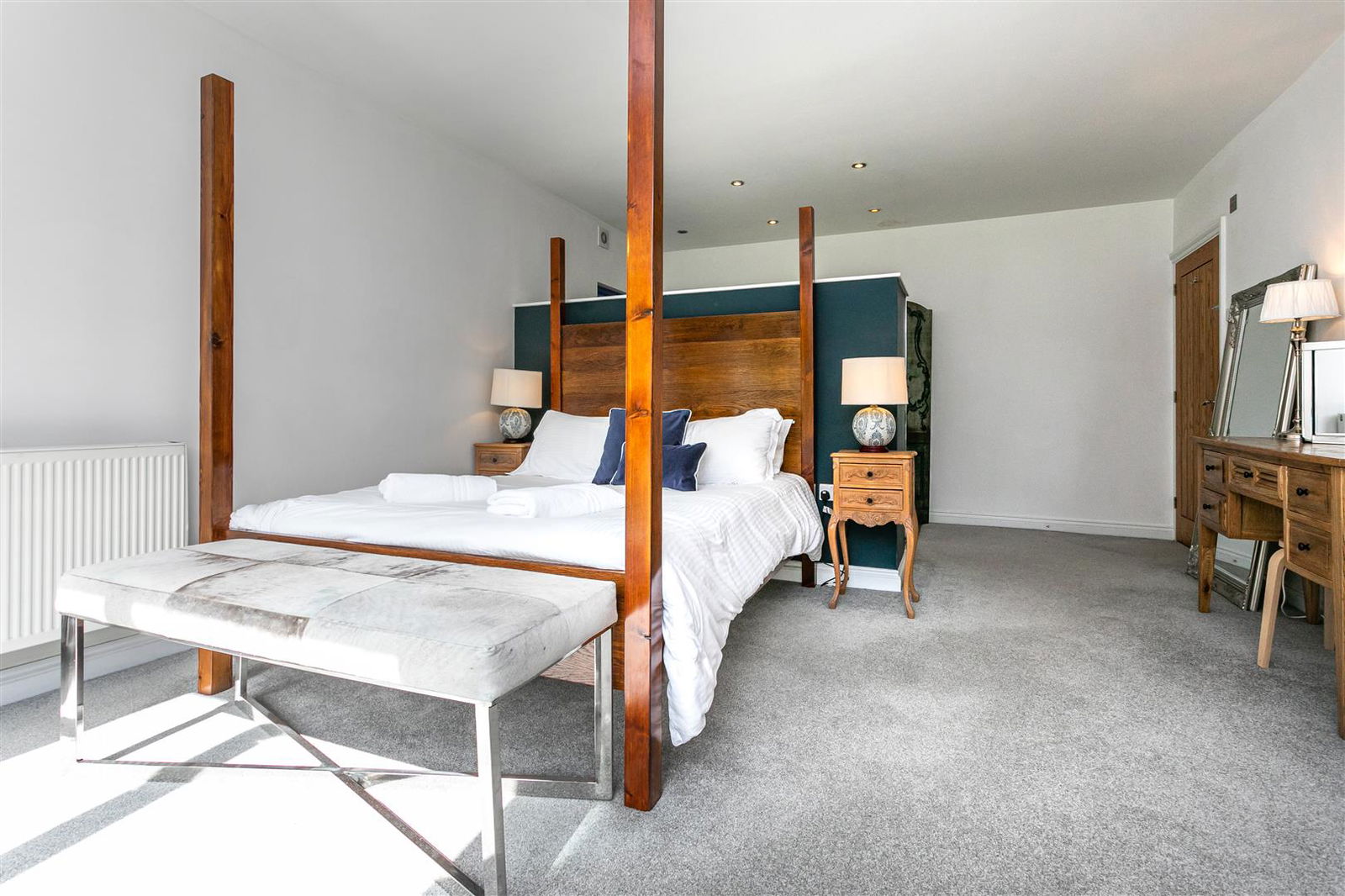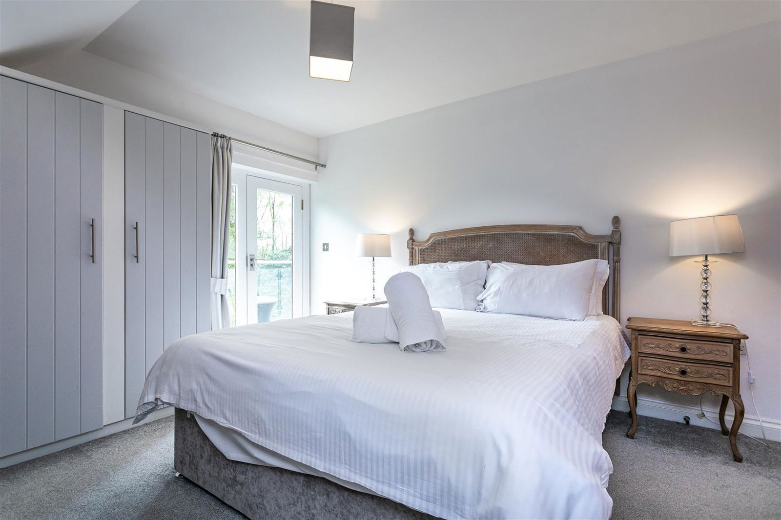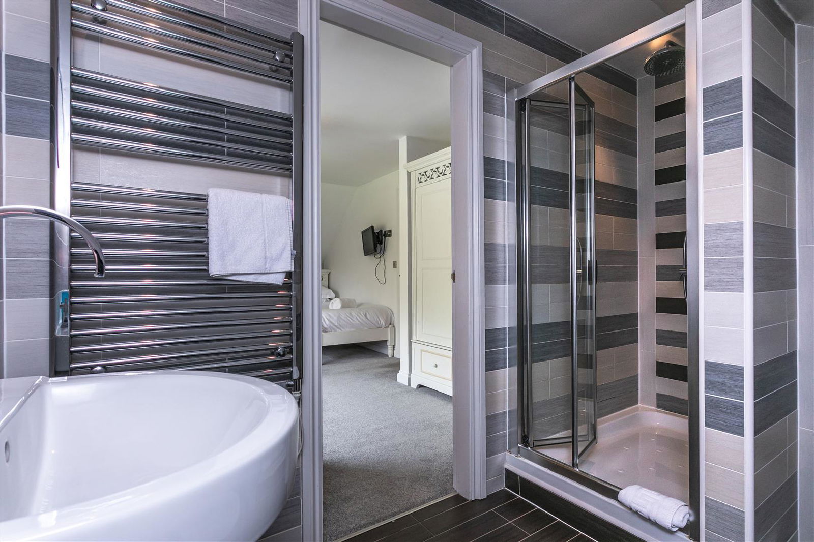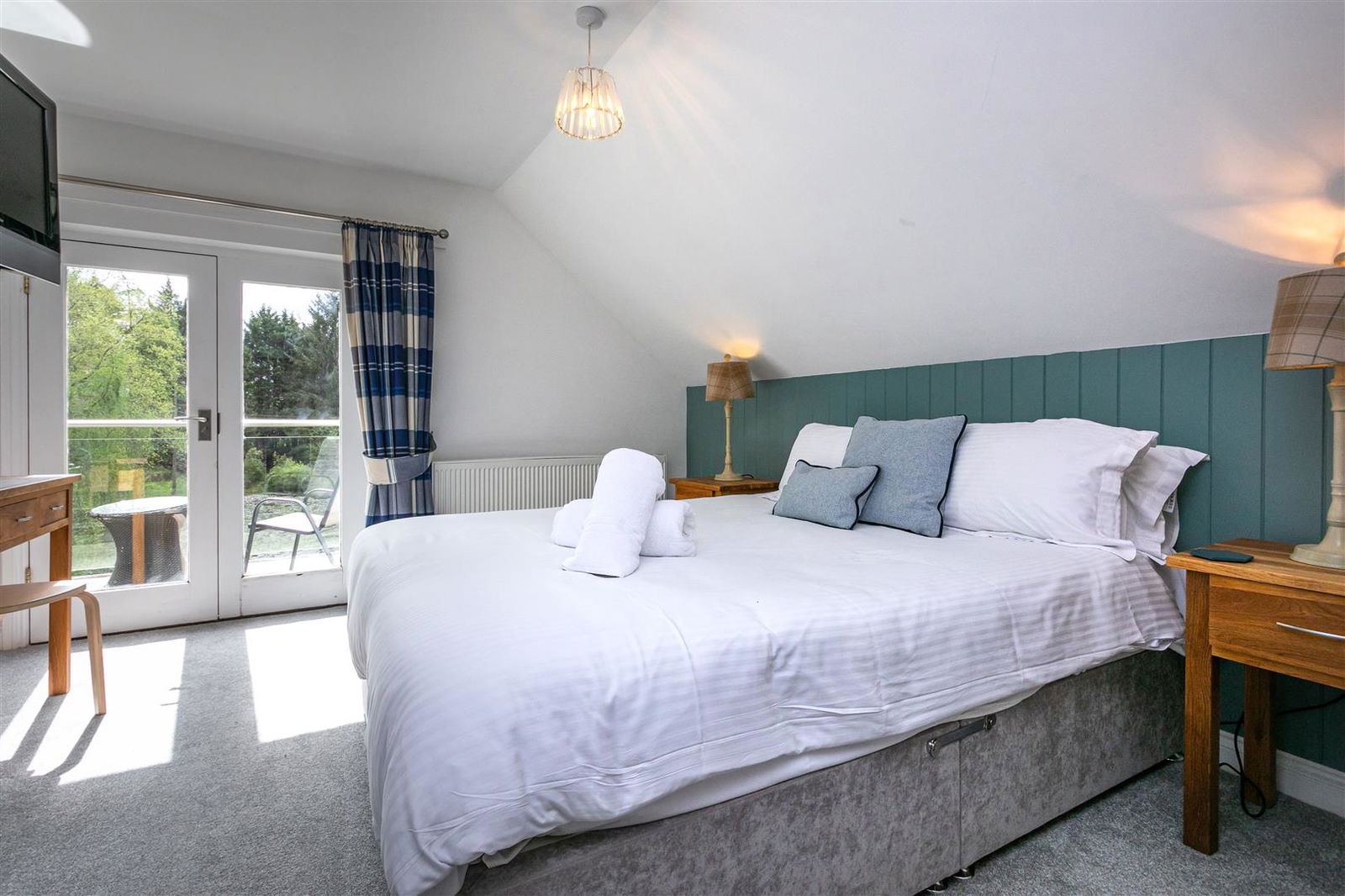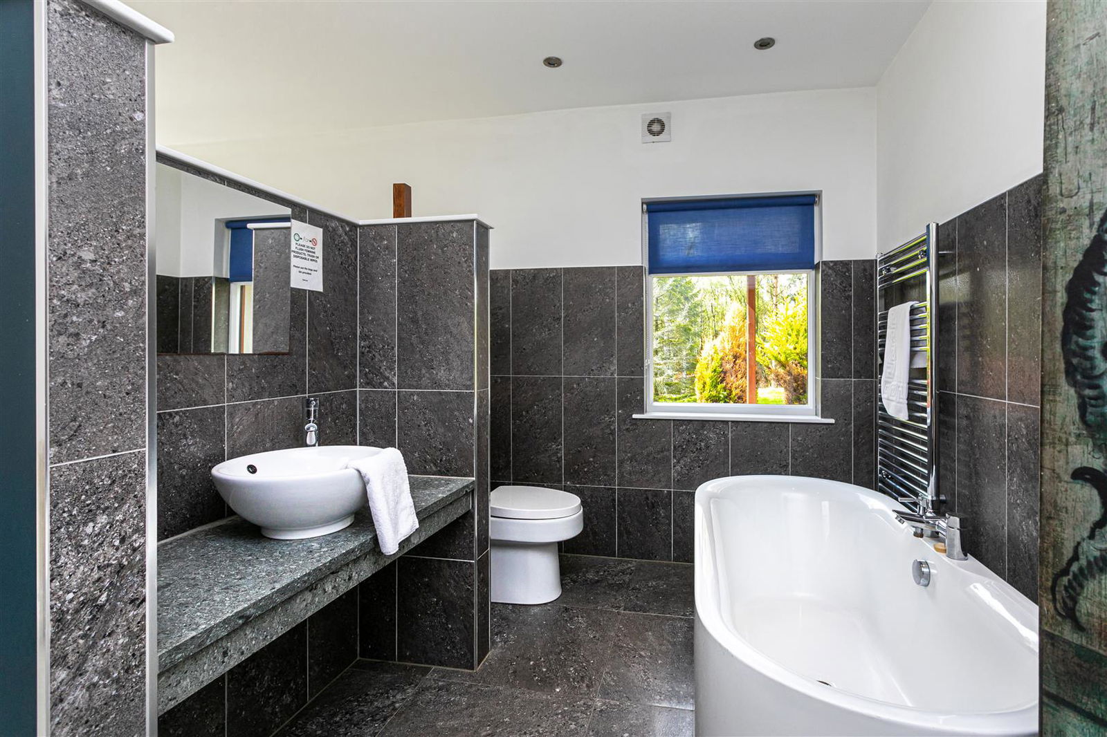 Waterside offers the flexibility of a ground floor bedroom, the views maximized by French windows and side picture windows. Oak doors front a built in wardrobe and a three quarters height partition separates the bedroom from an ensuite where there is a double ended free standing bath, wash bowl on granite plinth, loo and chrome heated towel rail.