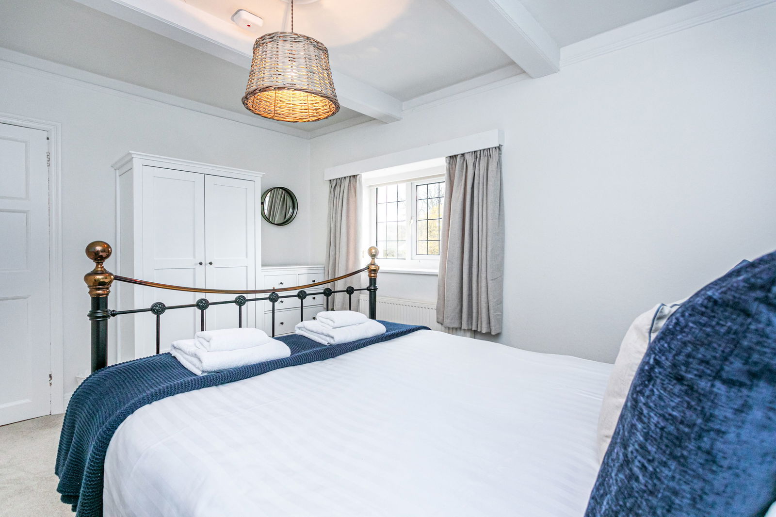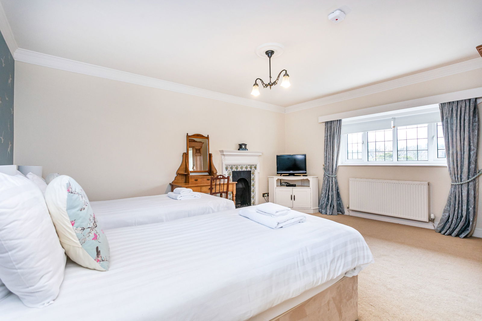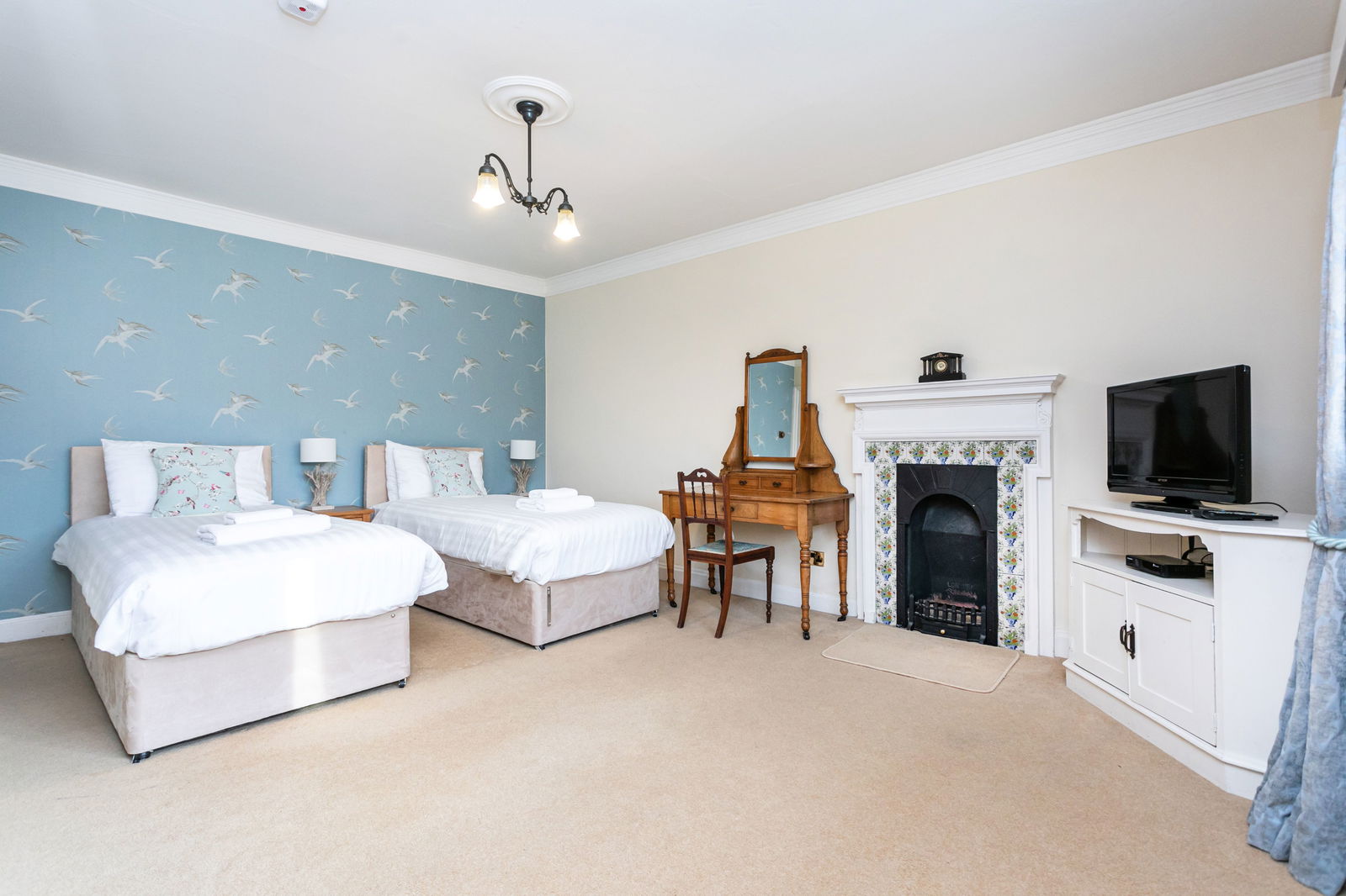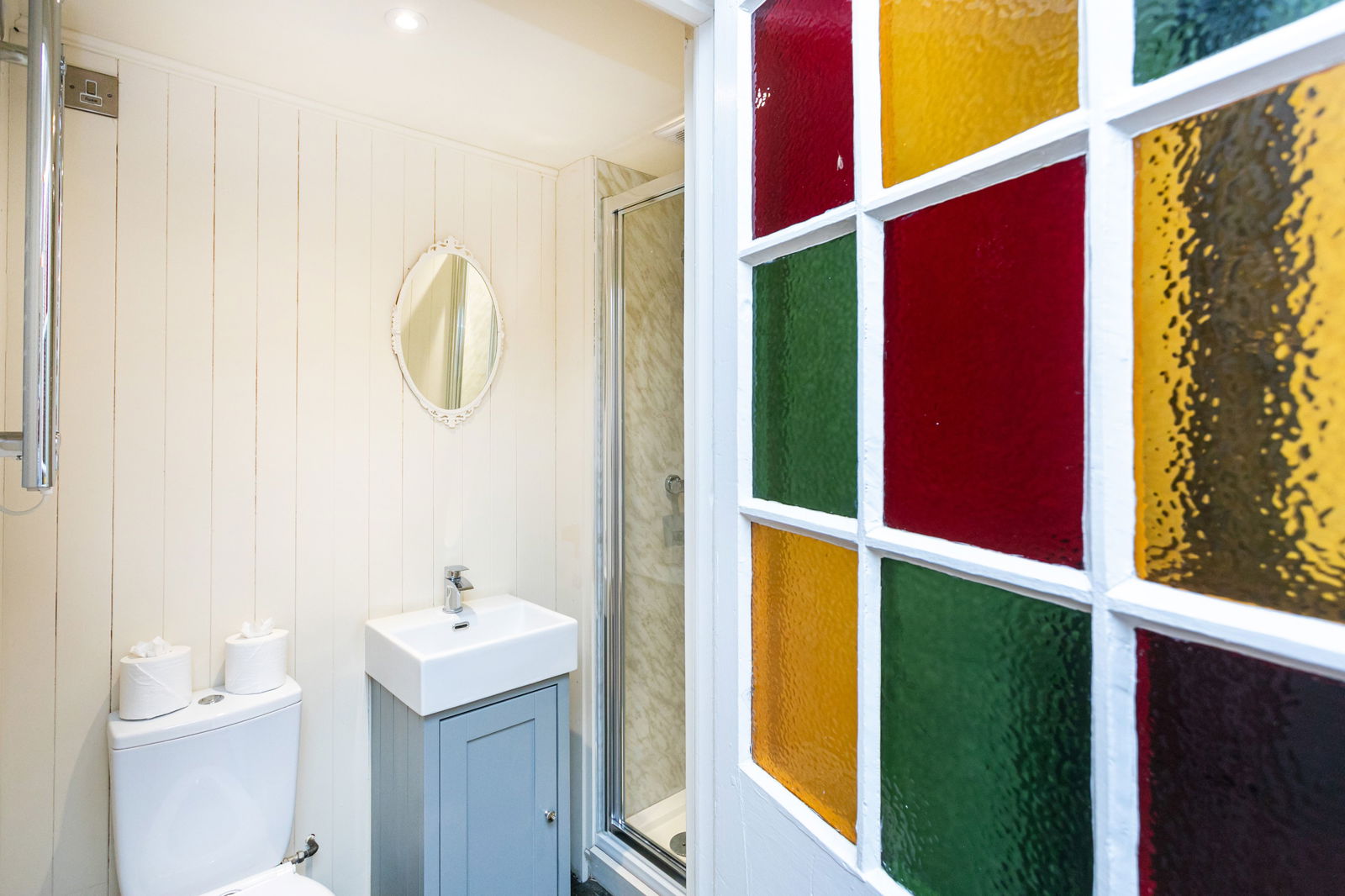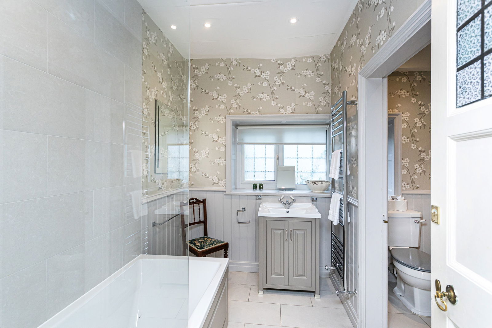 Completing the ground floor accommodation is a room now used as the sixth double bedroom, but it would also make a good snug or office. Both this room and the adjacent bathroom have original doors with leaded glass lights in the top two panels. The bathroom suite is a more recent installation, traditionally styled with contemporary touches it complements the architectural style well.