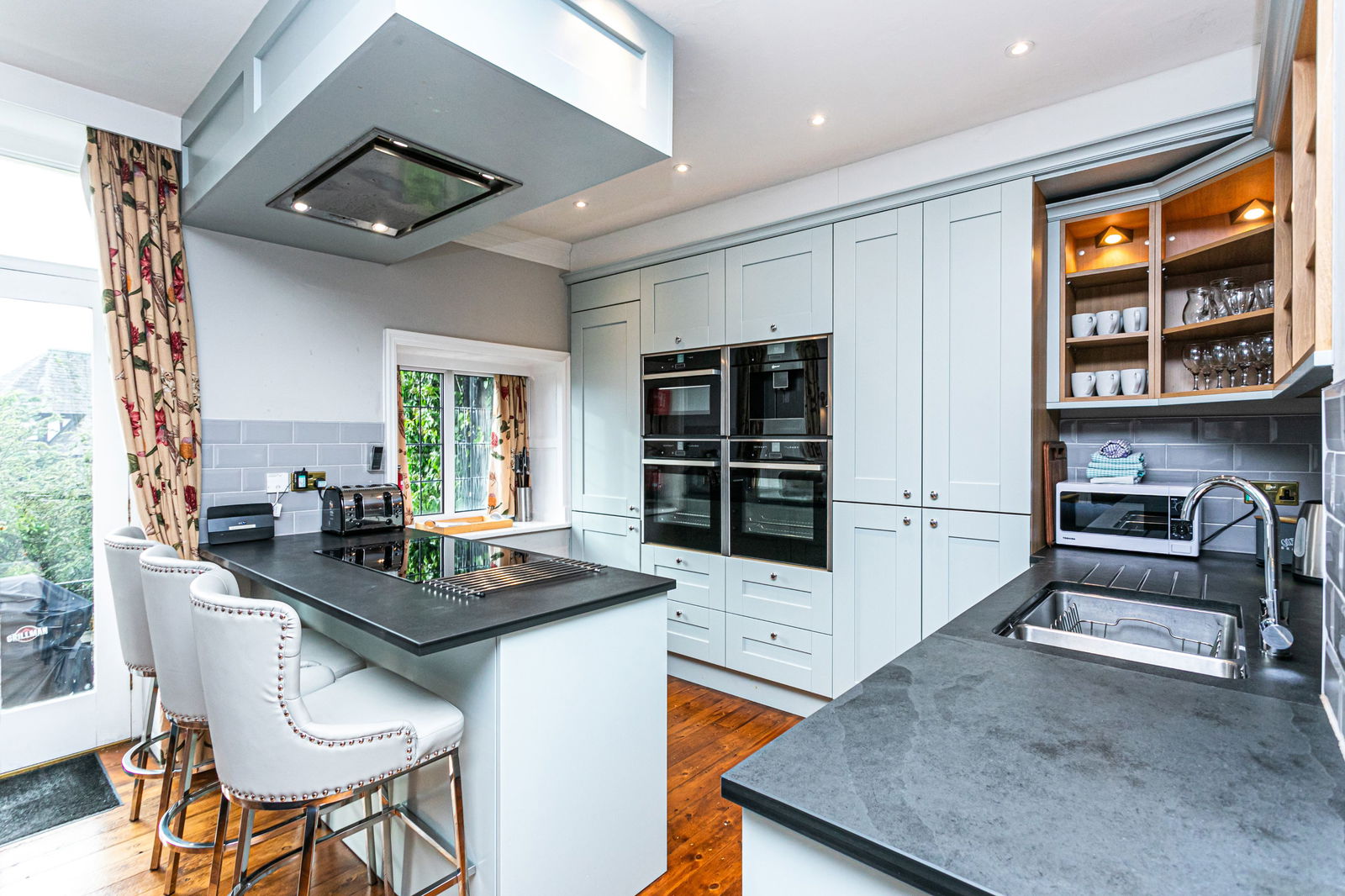 The inviting living kitchen offers room to cook, eat and relax; a great family space with an open fireplace and French windows leading out to the seating terrace, conveniently placed for taking food outside when the weather is conducive to dining alfresco. The kitchen cabinets offer plenty of storage and there’s good open shelving as well, the doors are painted a soft green which contrasts smartly to the black slate worktops. A sociable space, the hob is set into the peninsular unit which extends to a breakfast bar. NEFF appliances include three ovens, a coffee maker, fridge and freezer with a John Lewis dishwasher. There’s a separate dining room next door with a Lakeland slate floor, an original open fireplace, period alcove cupboard and the original servants’ bellboard. At the far end of the ground floor is a playroom, it’s from here the back stairs lead up. The deep shelved cupboard is perfect for toys, but the room would also make a lovely hobbies room or office. Adjacent is the laundry room, a good working room, it houses the boiler, washer, dryer, overflow larder fridge and tall freezer.