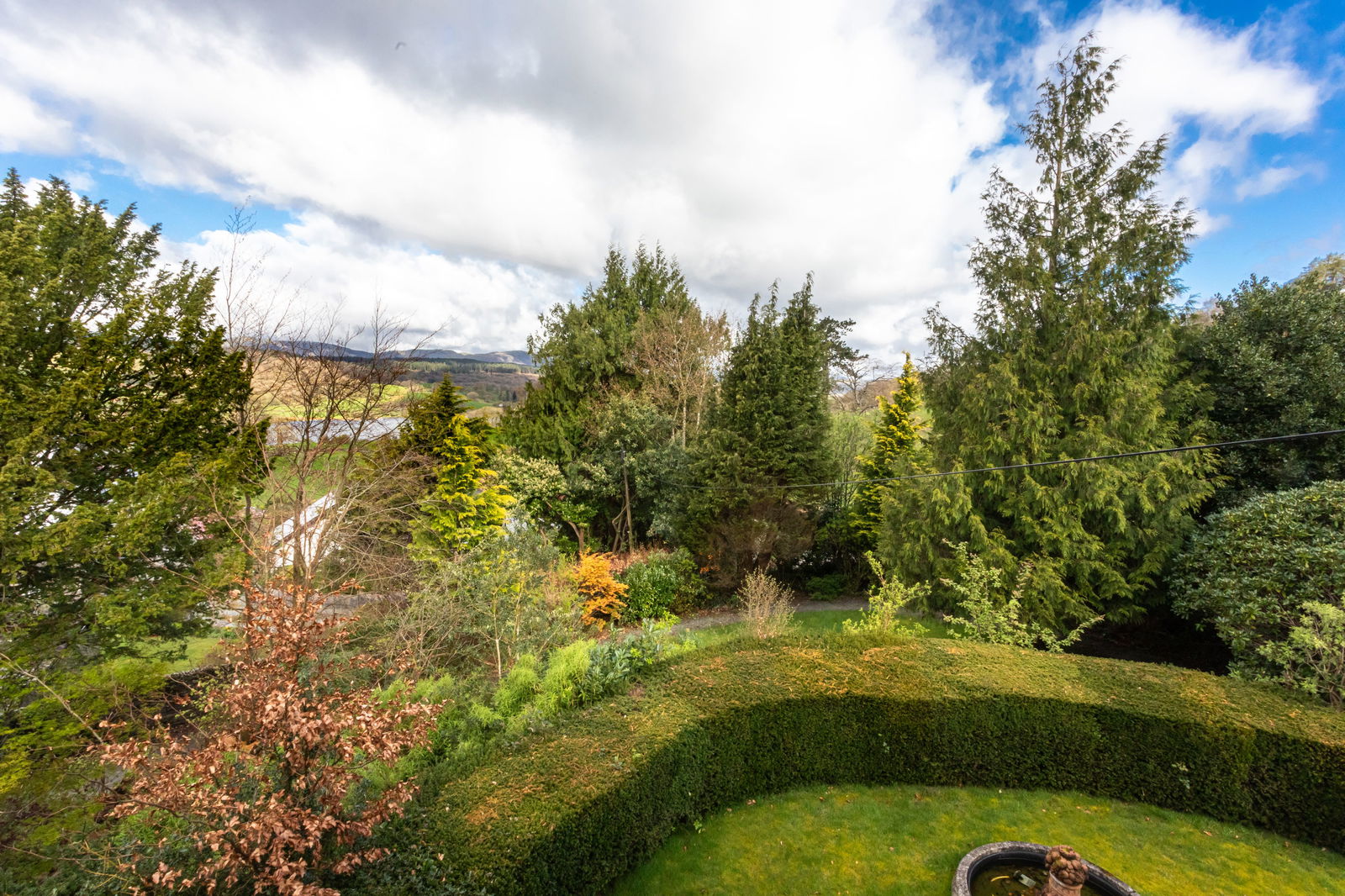 Off the drawing room is a semicircular garden with a central pond, surrounded by clipped yew hedging there is a view over the lower garden and neighbouring trees to the fells beyond. A path leads around the lower garden and encloses an informal lawn, the planting is mature and creates a private setting for the house.