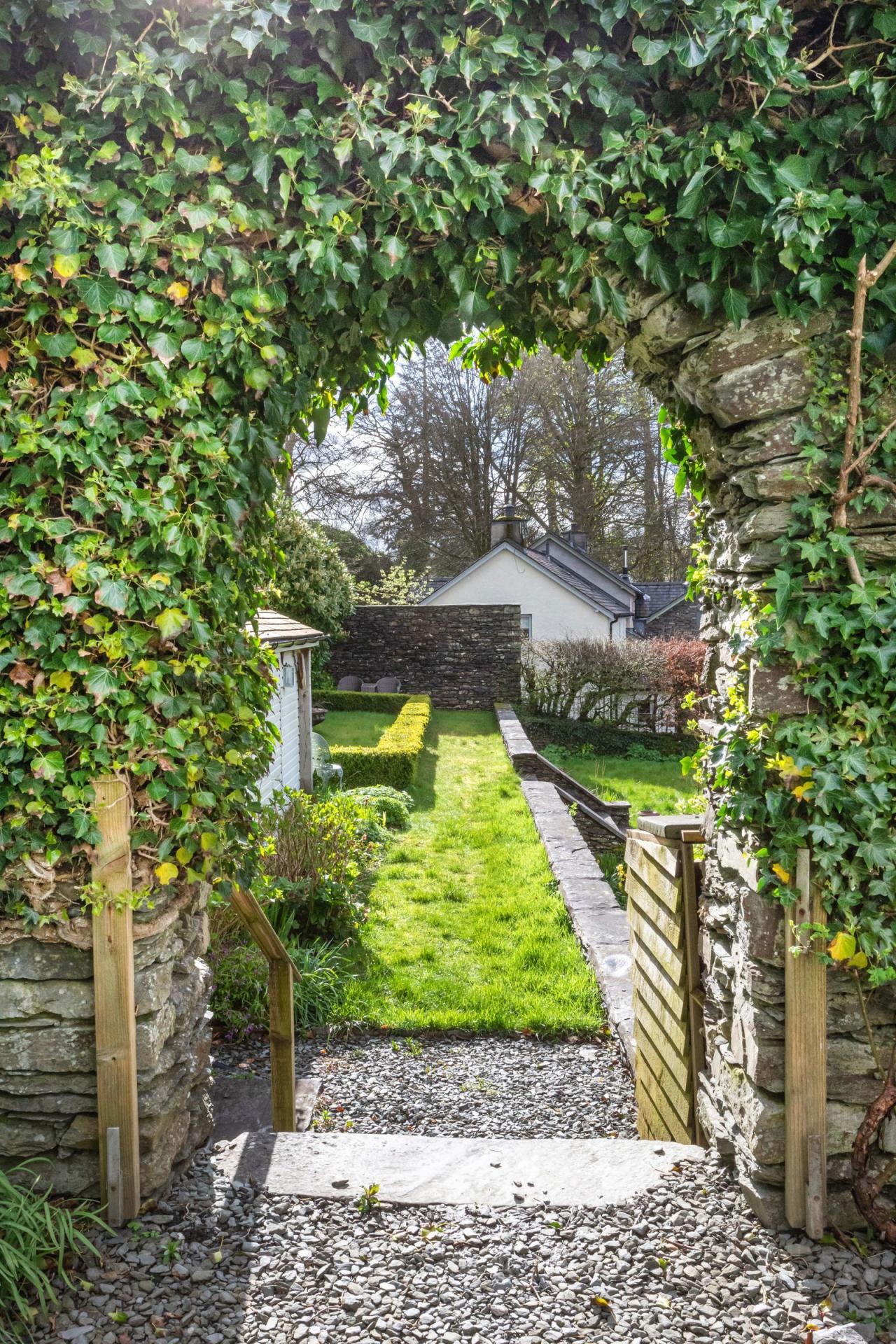 Bordering the courtyard a Lakeland stone wall opens under an archway to the lower garden area, walled and more formal it is set on two levels and has planted borders, lawns and a formal pond. It is here that the Summer House is set.