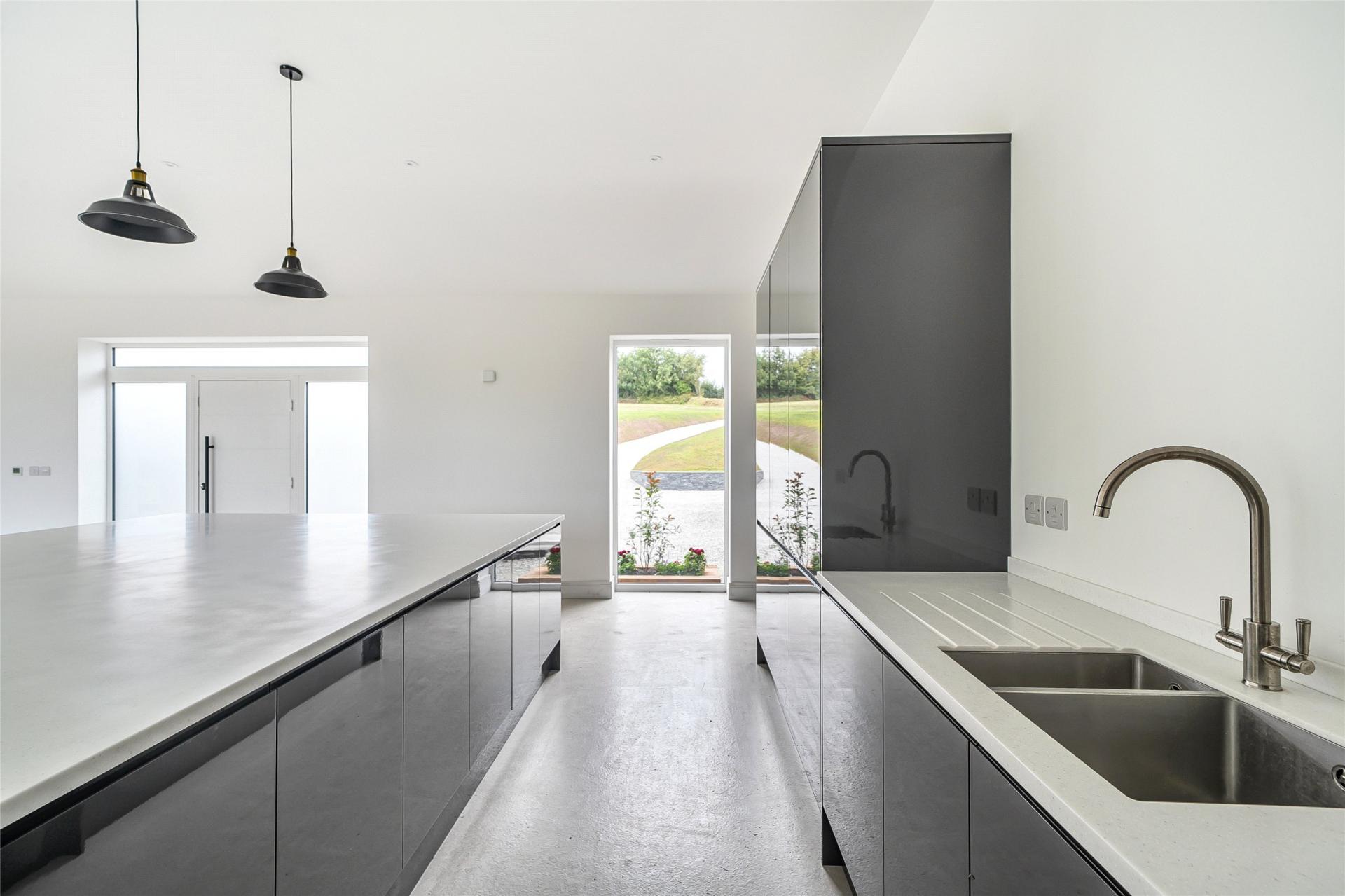 The main entrance brings you into a magnificent room approximately 60 foot by 22 foot. Large patio doors give access to the western terrace and tall floor to ceiling windows either side of the contemporary log burner allow the owner to survey their own land from the comfort of their sitting room. At one end, there is a state of the art kitchen with large island, hob, oven and extractor fan, built in fridge, freezer and dishwasher and wine cooler.