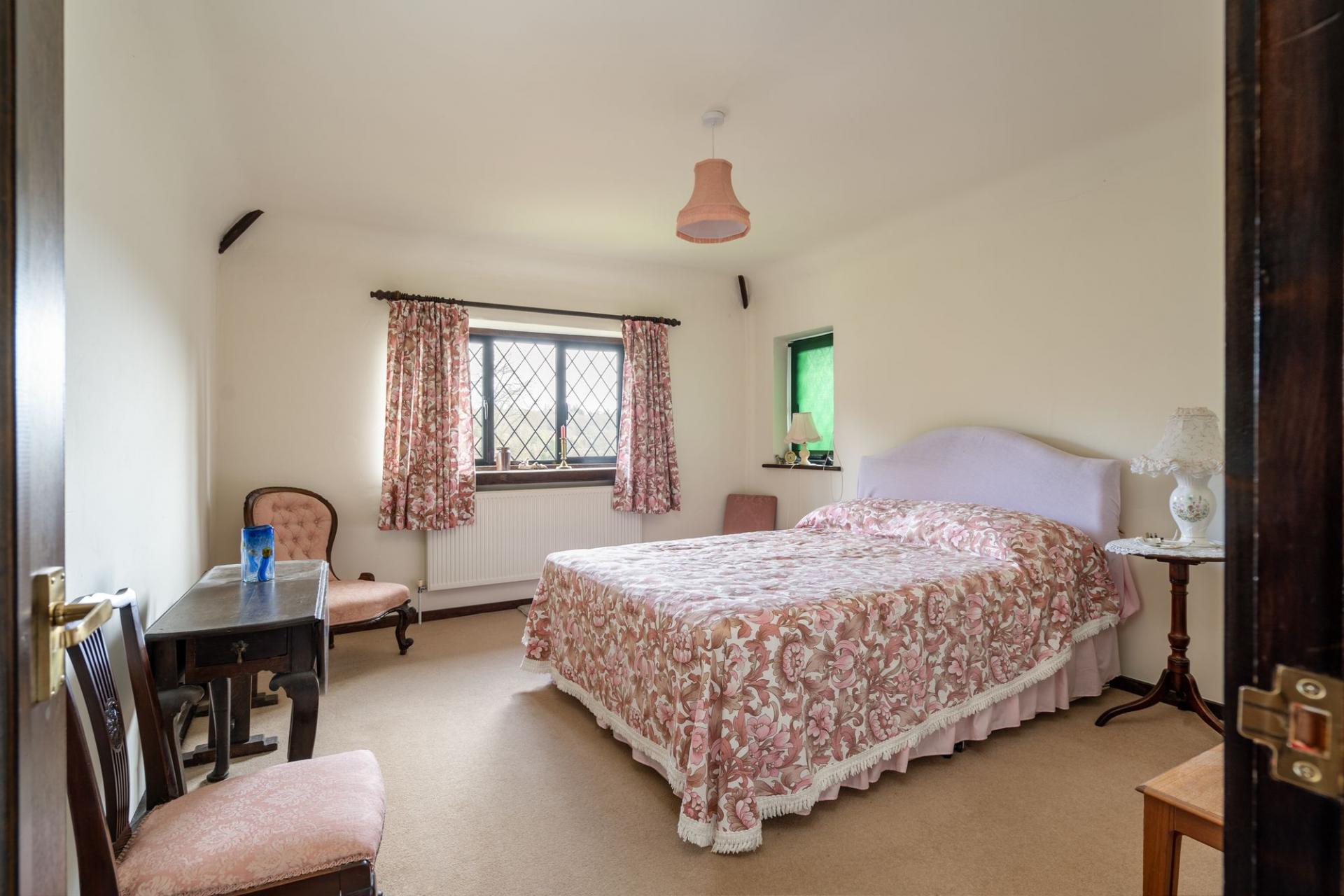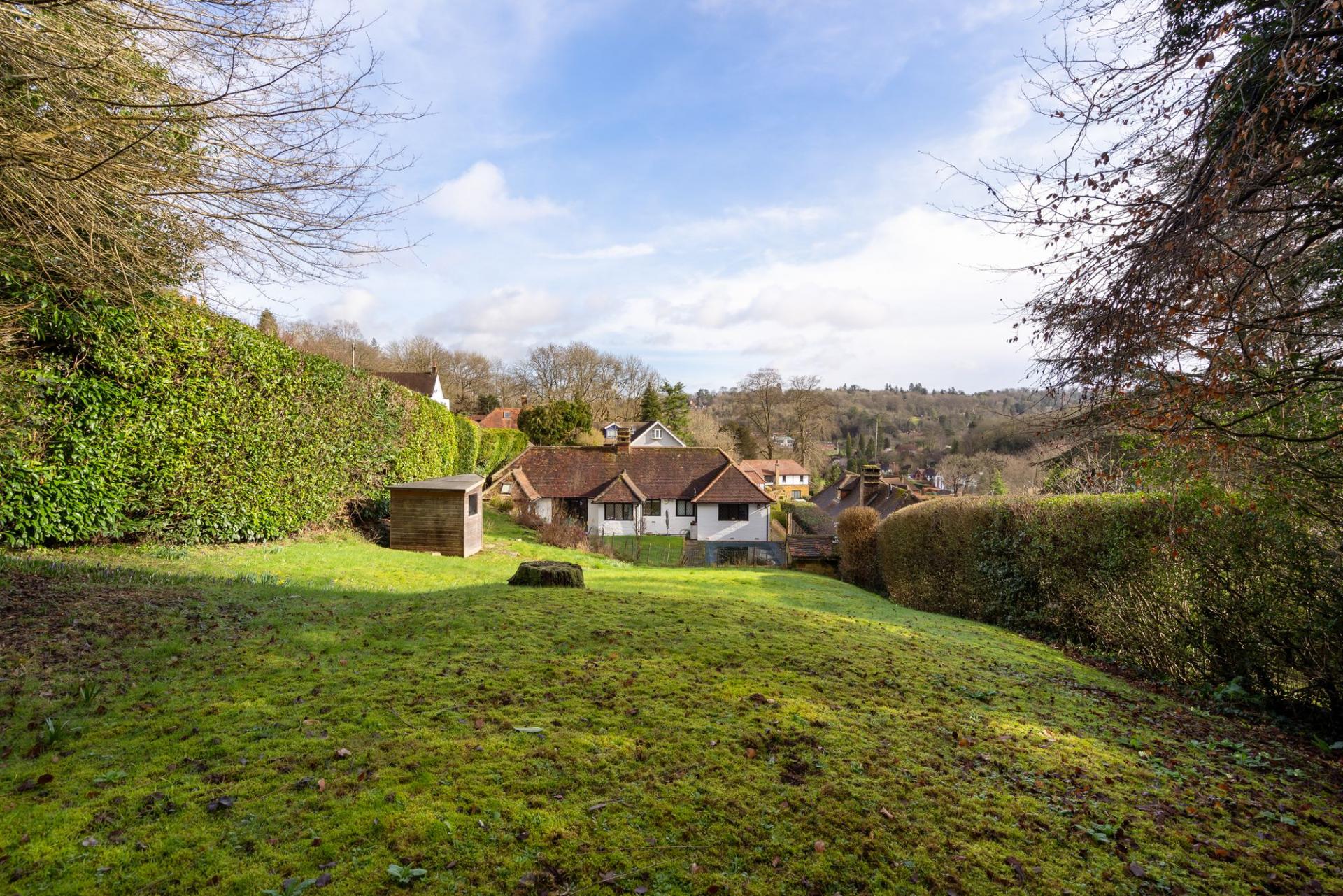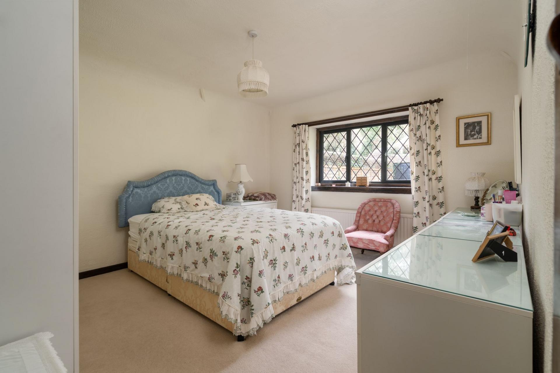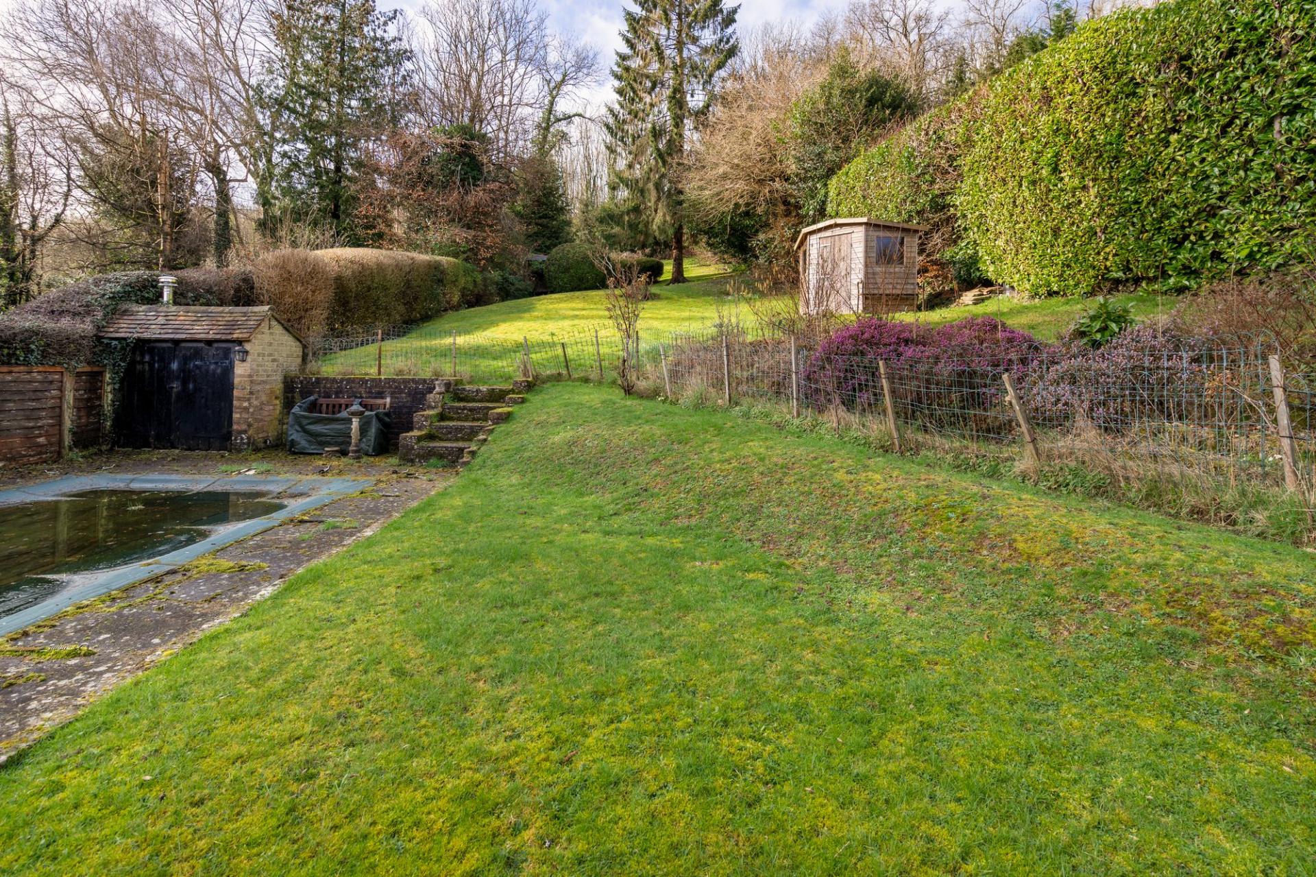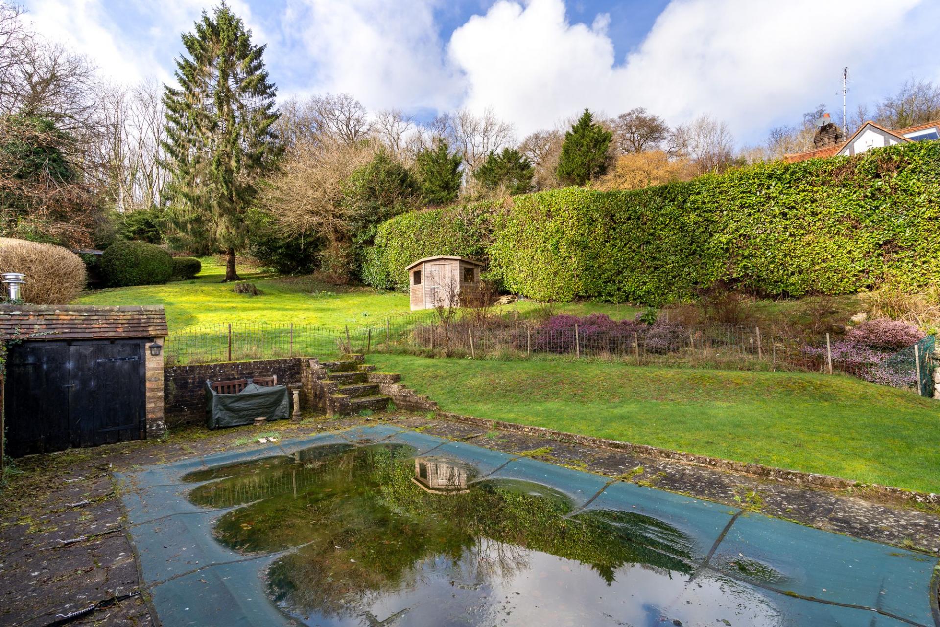 The front garden is approached via a newly laid, resin bond driveway, providing off road parking for a couple of cars, leading to an attached large single garage, housing the boiler, with a pitched roof offering additional storage. Level lawn areas with raised beds for planting. Pathway leading to the front door and gated access to the rear garden to one side. The rear garden, being a private oasis, faces South West and features a heated SWIMMING POOL, ideal for enjoying leisurely swims or entertaining guests during warm summer days. The swimming pool is surrounded by patio with a brick built outhouse which houses the boiler to heat the pool. (NB: The swimming pool is in need of attention). There are steps leading up to a sloping lawn with mature trees, shrubs and hedging to each boundary. To the rear of the garden, there is access to a woodland area, which this property alone has sole rights to. In all the grounds extend to one third of an acre.