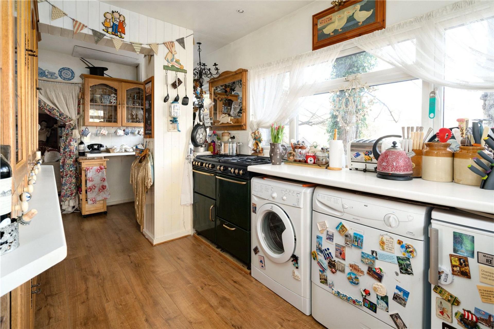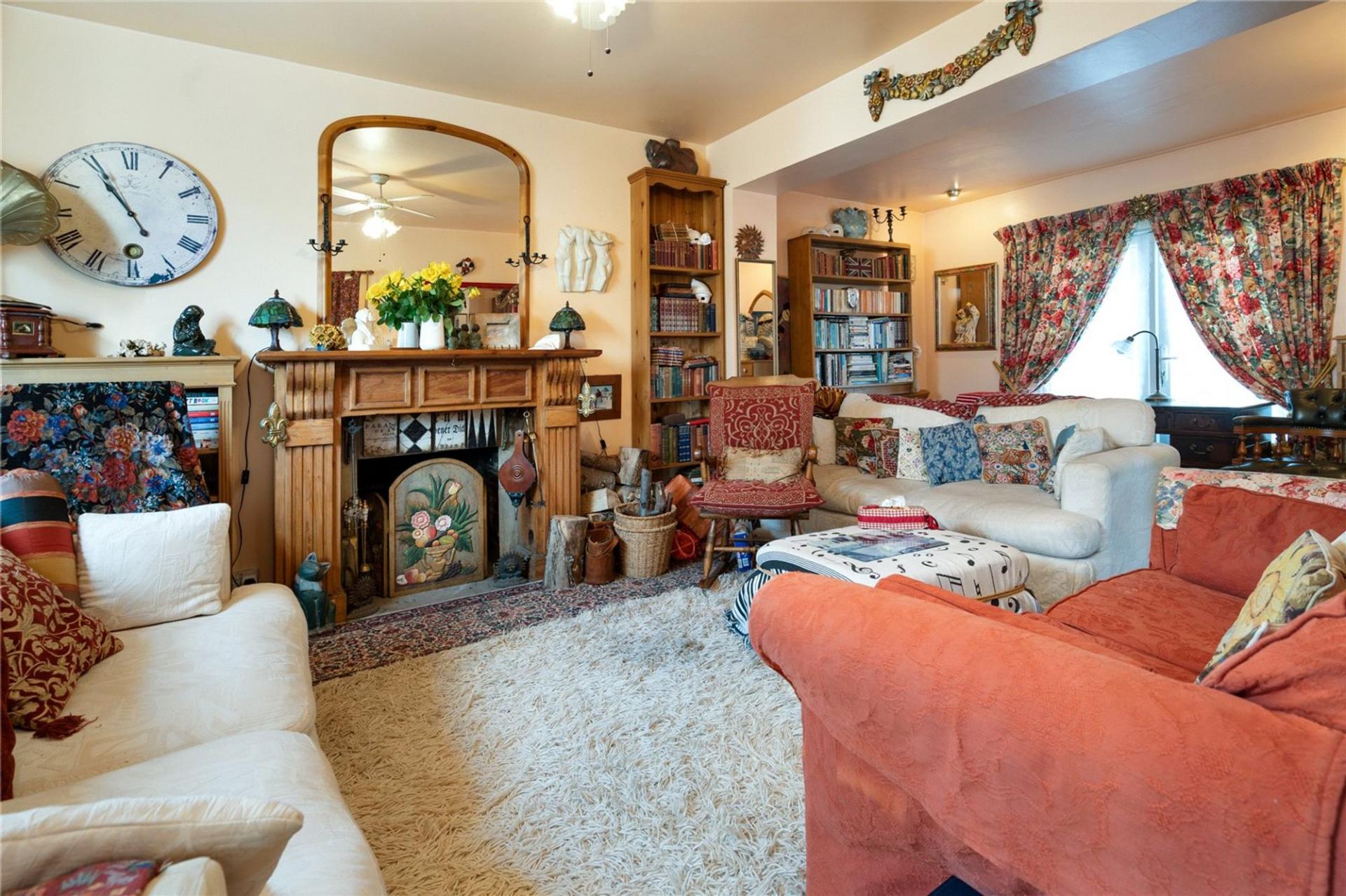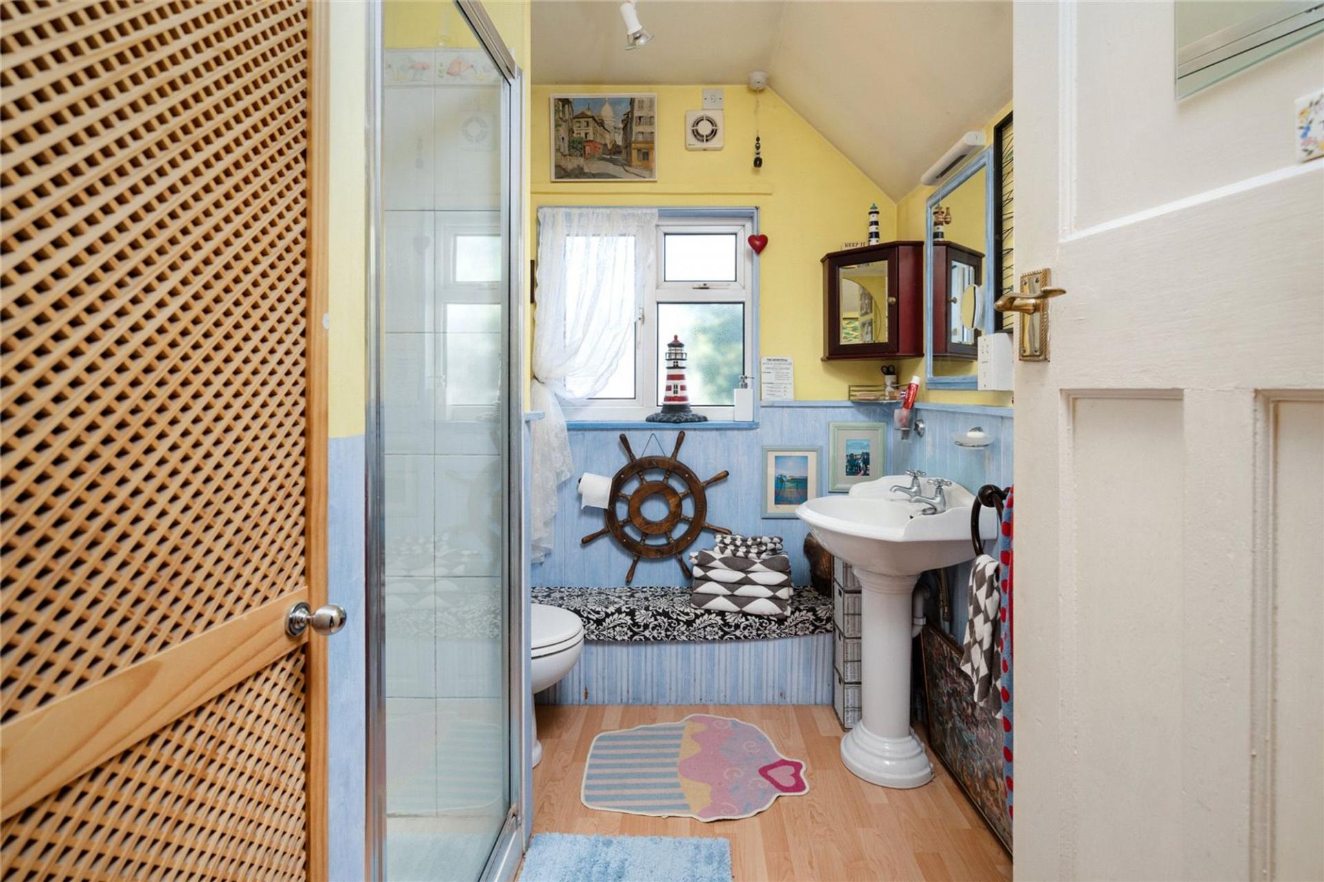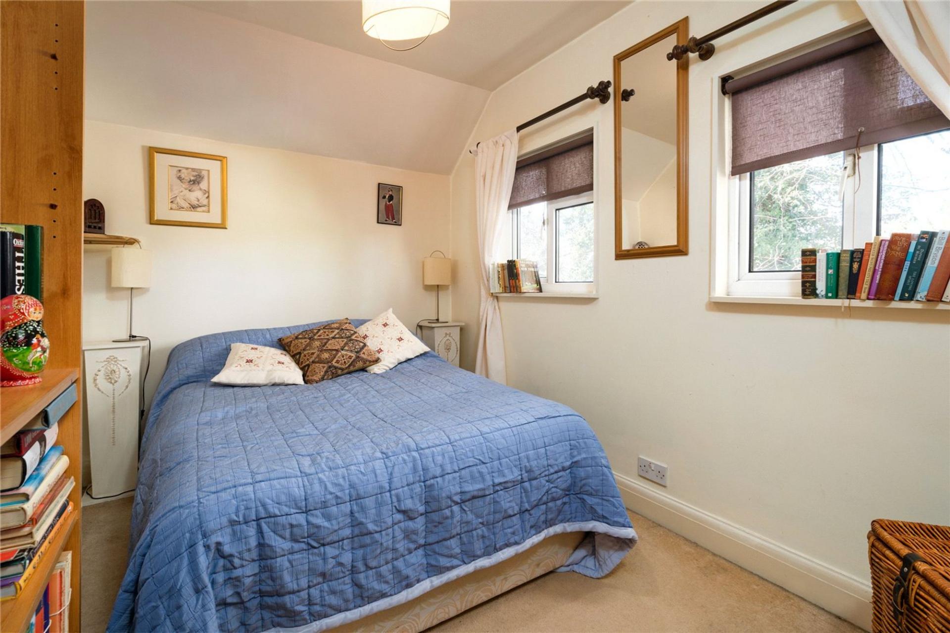 The large living room with open fireplace has a dual aspect and French doors open out onto a private terrace. The kitchen houses a comprehensive range of storage cupboards and serves a delightful Dining room. The ground floor accommodation is complimented by a comfortable sun lounge which looks down the length of the garden and a ground floor cloakroom with toilet and large understairs storage cupboard.