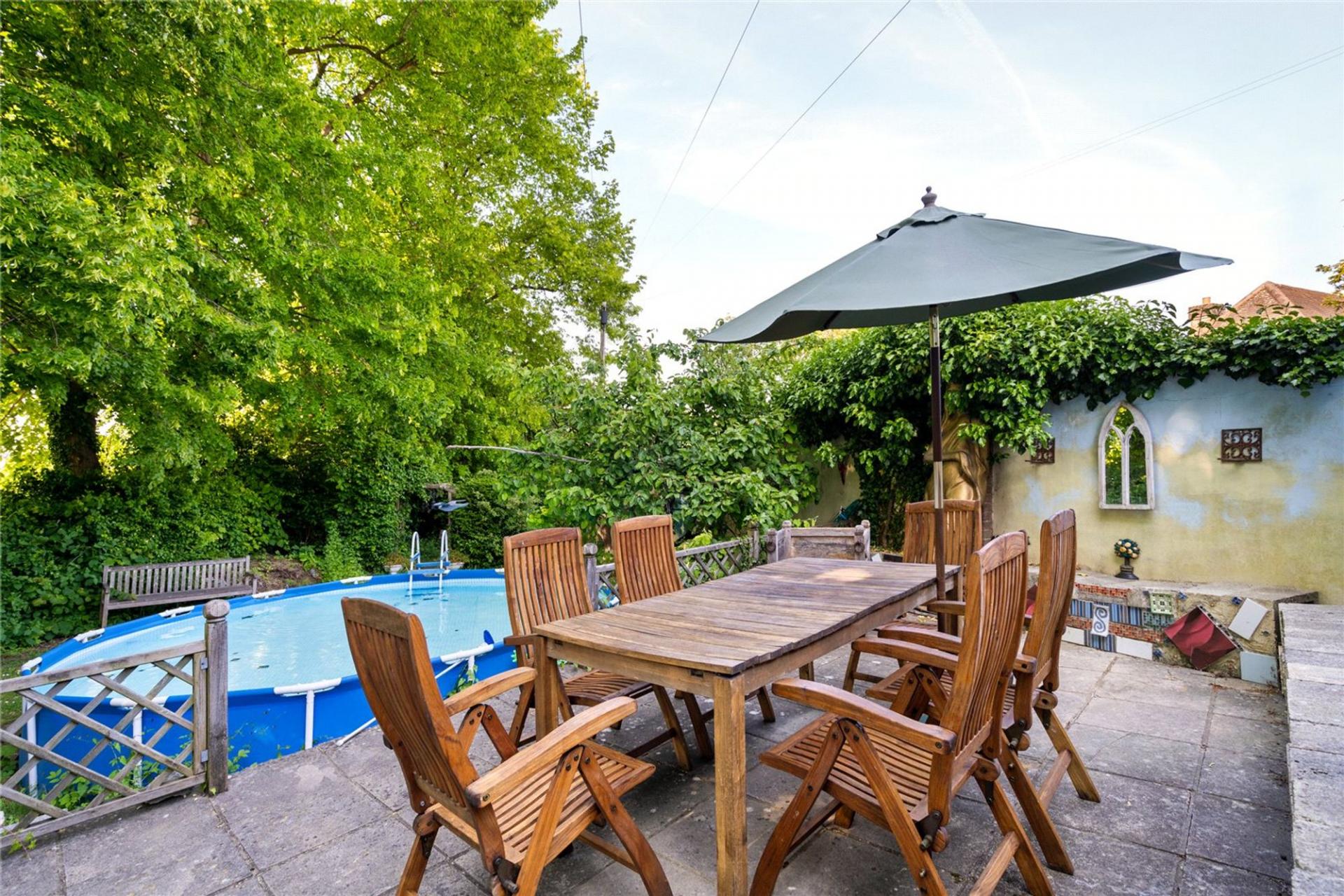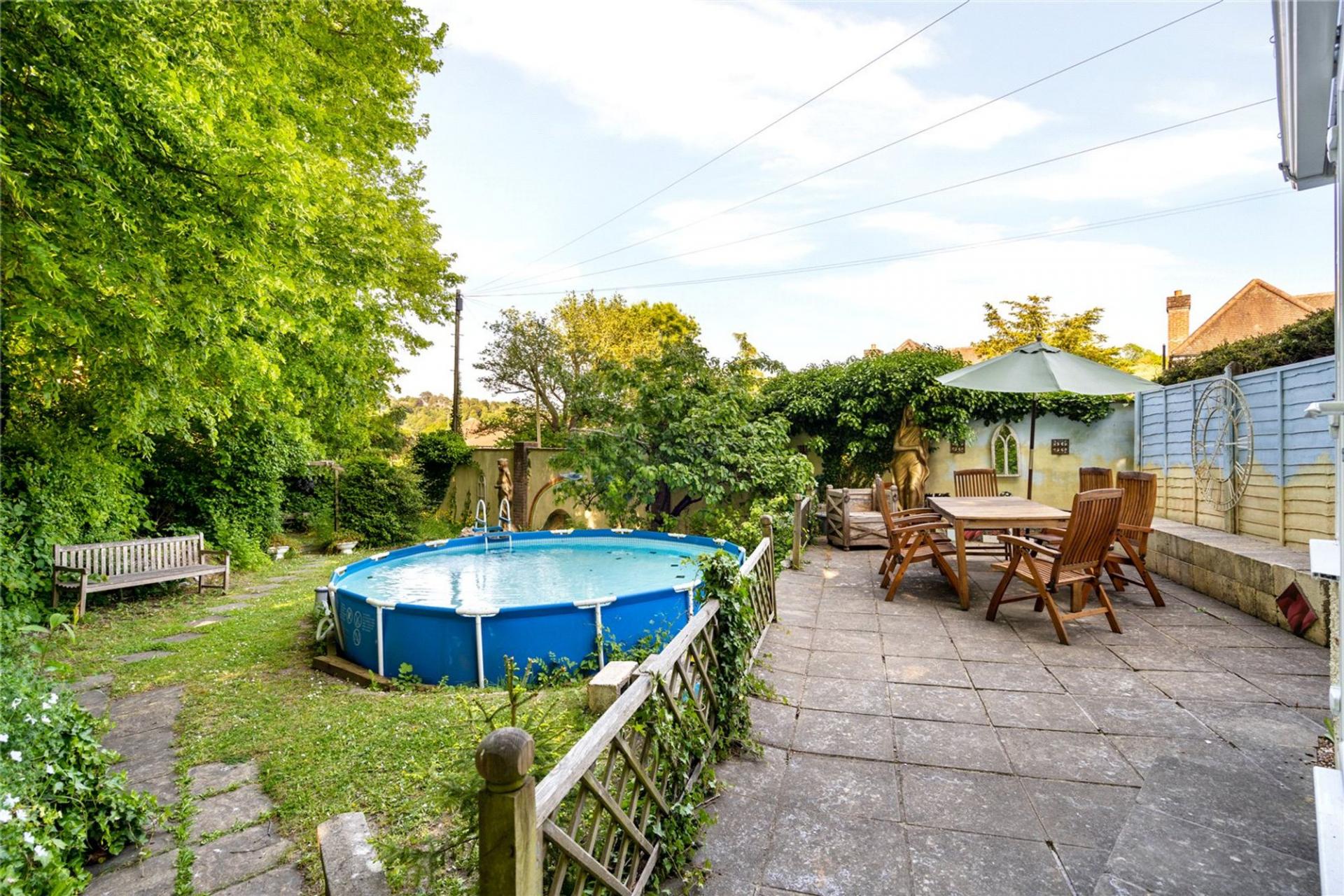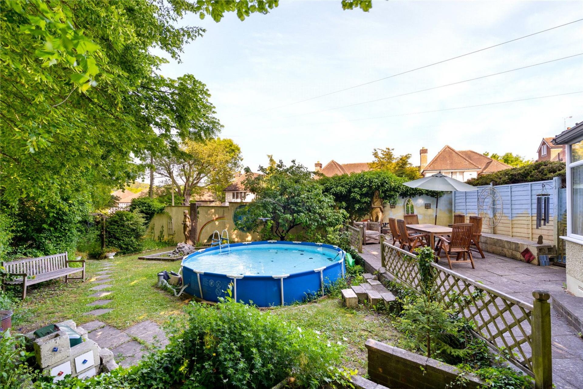 Areas of lawn and raised flower beds beyond a good sized stone laid terrace surrounding the conservatory. Well maintained stand-alone swimming pool. Further steps down to original enclosed Anderson shelter which is ideal for wine storage. Gate to front garden with shrubs.
