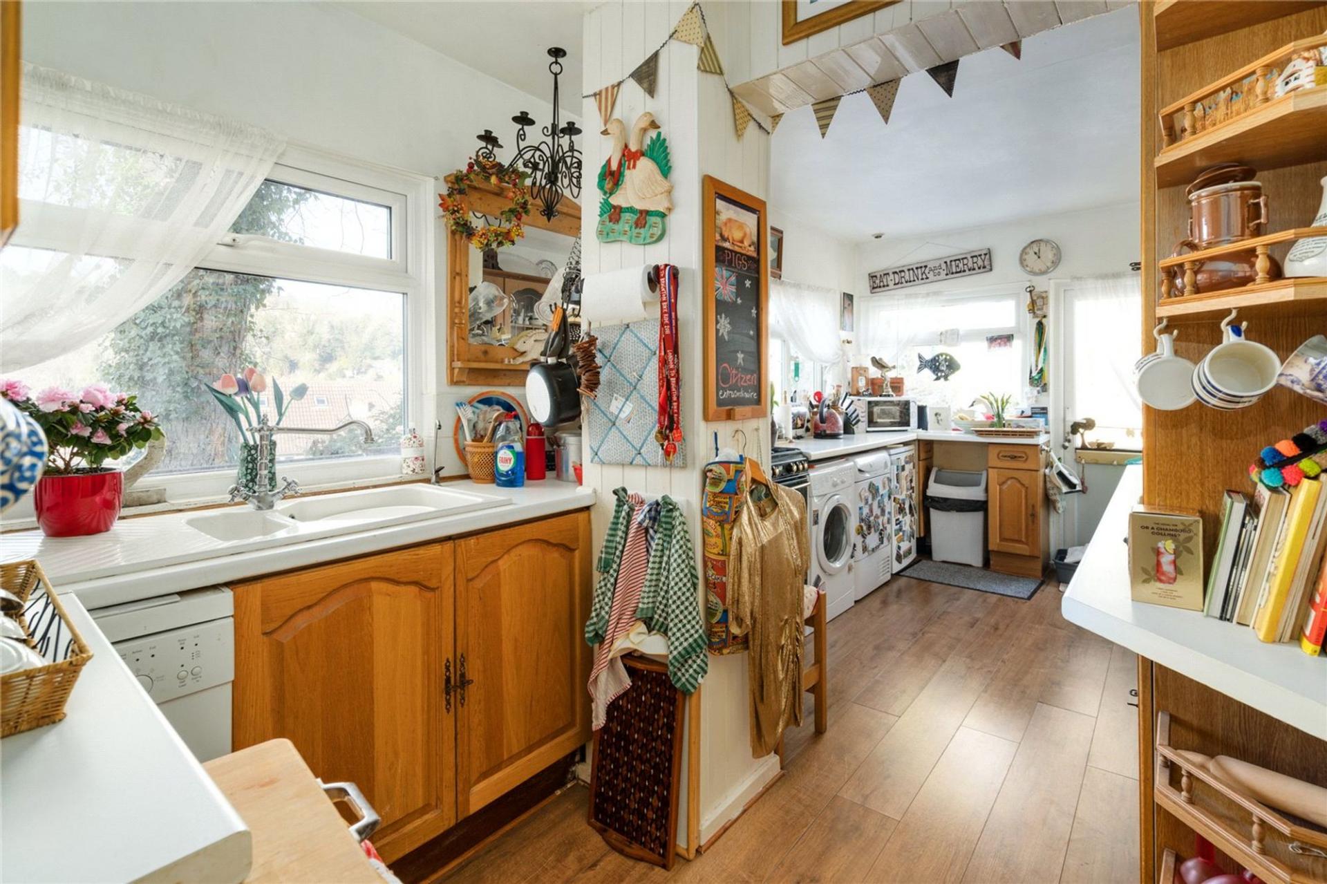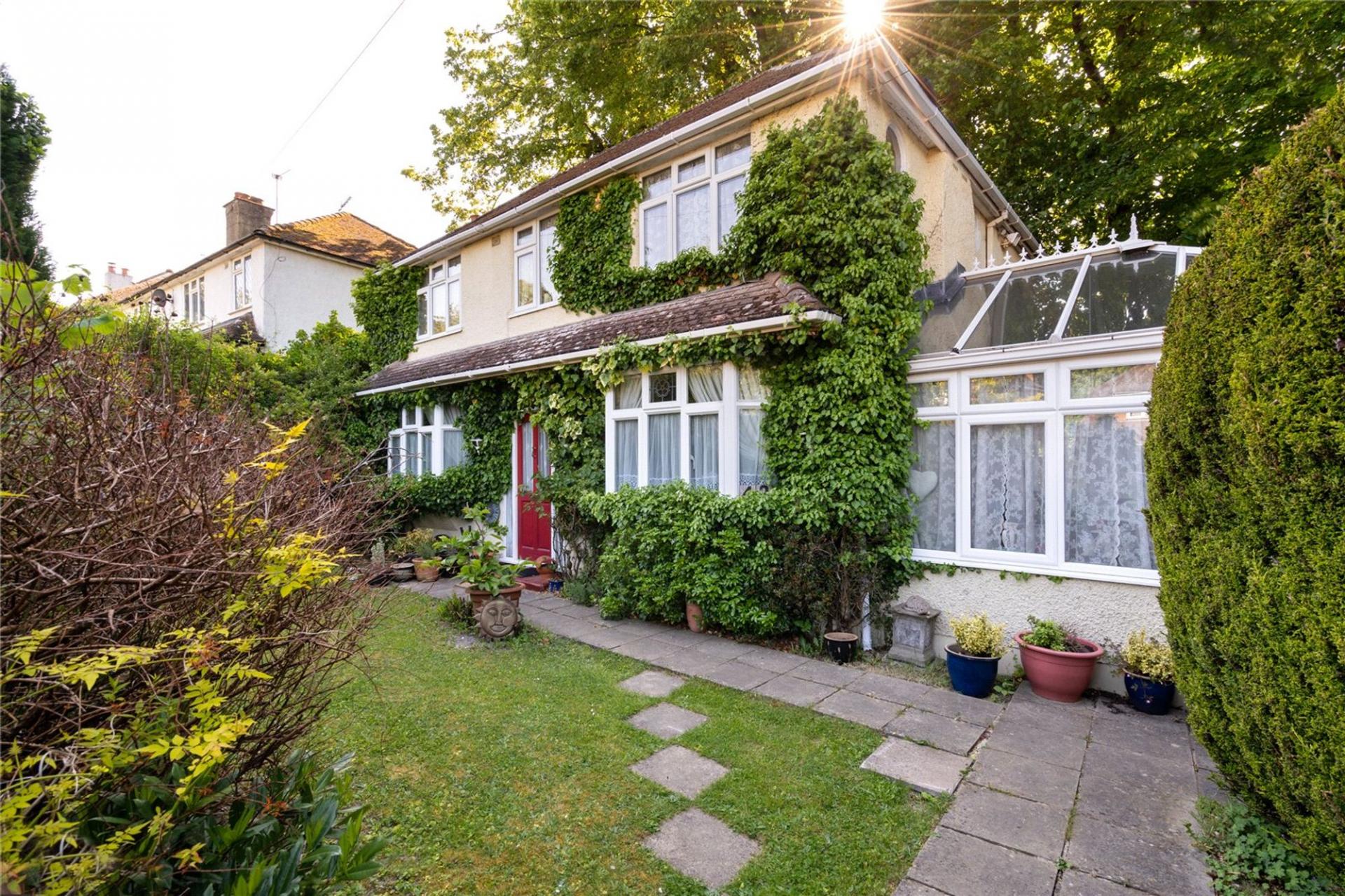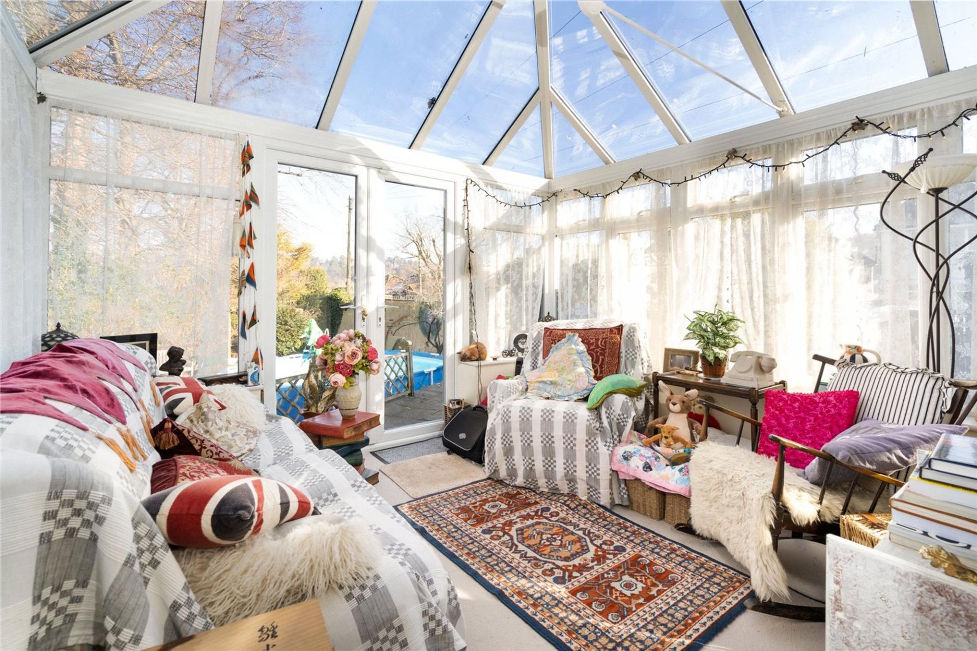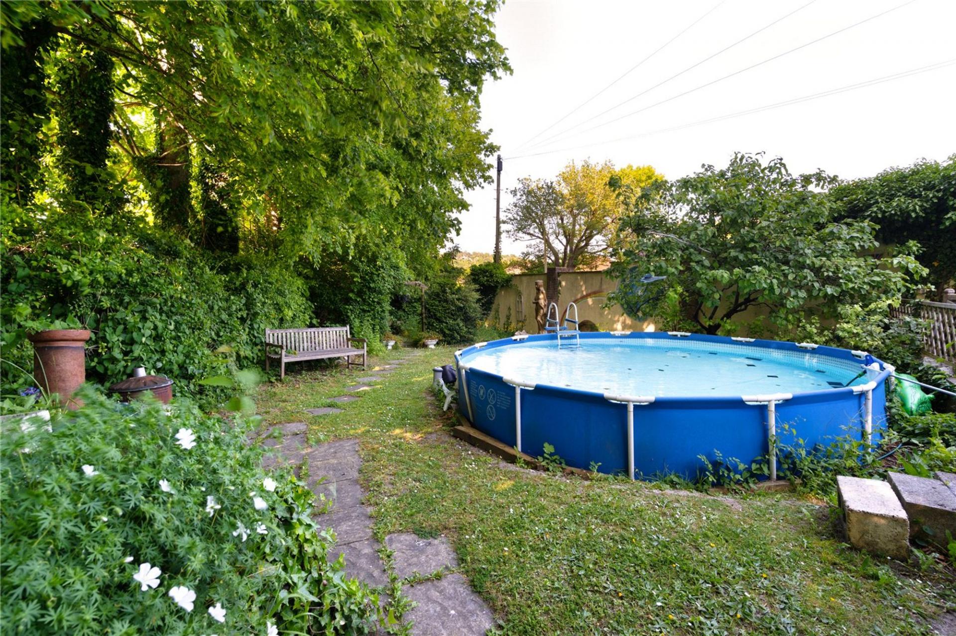Areas of lawn and raised flower beds beyond a good sized stone laid terrace surrounding the conservatory. Well maintained stand-alone swimming pool. Further steps down to original enclosed Anderson shelter which is ideal for wine storage. Gate to front garden with shrubs.