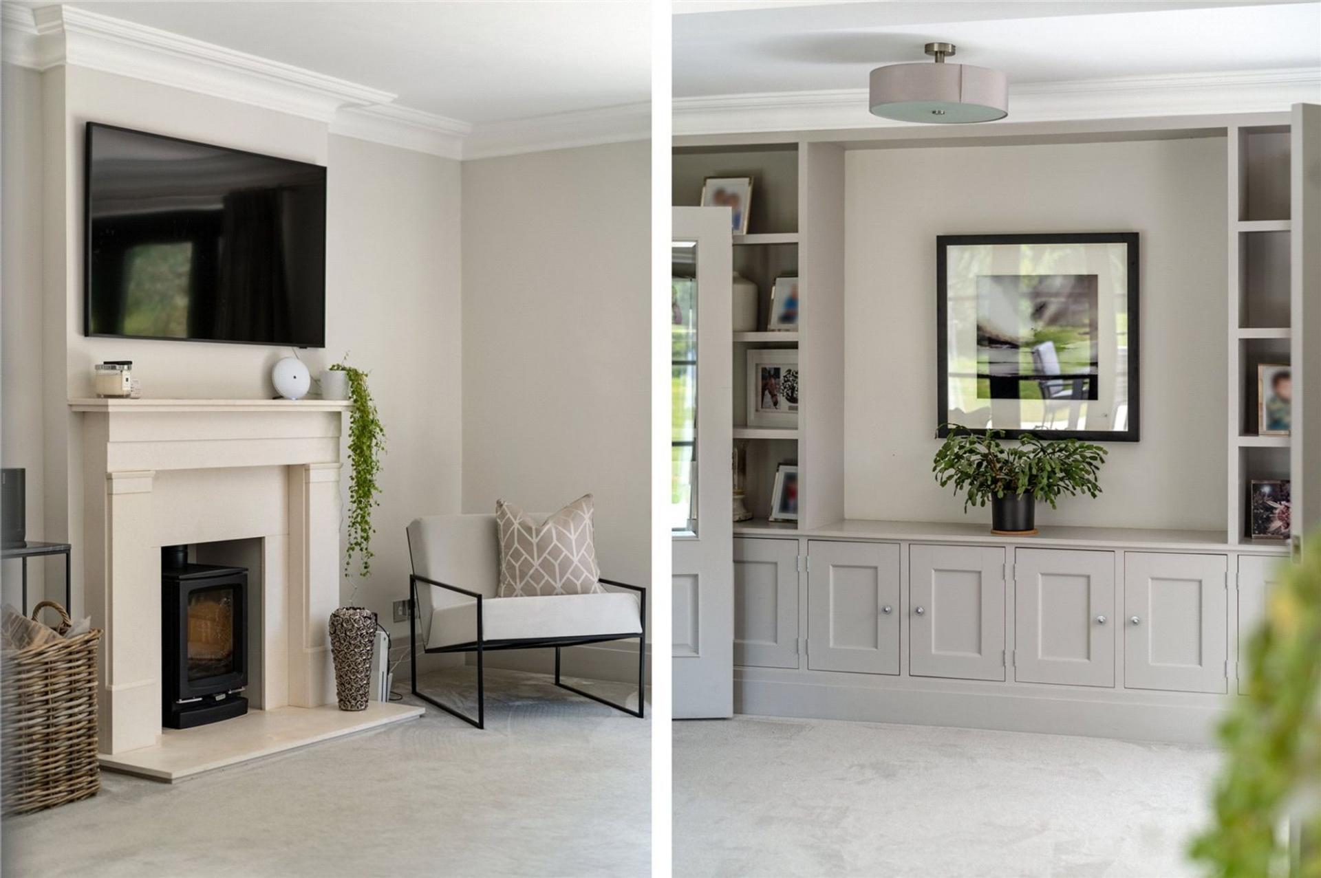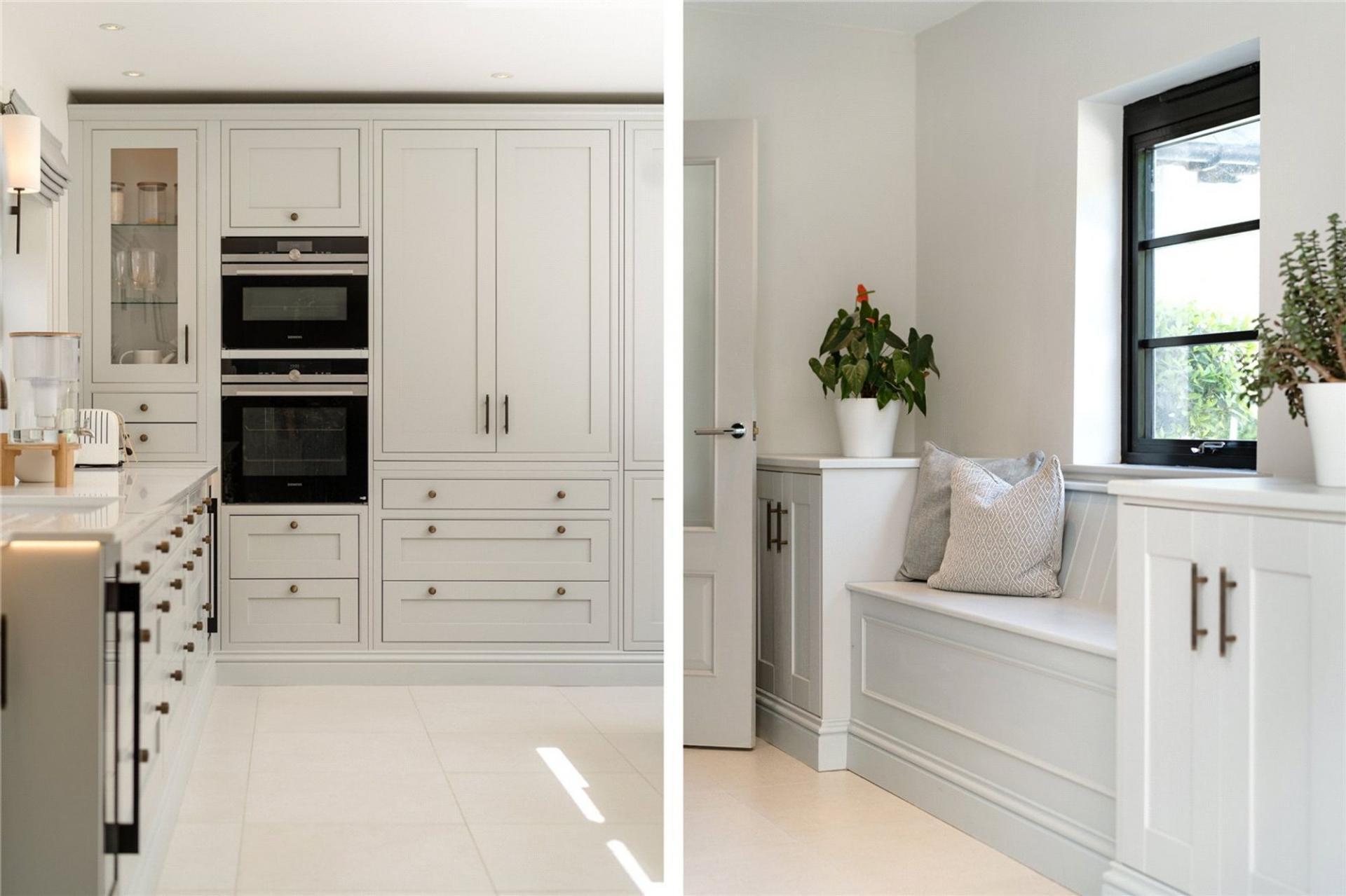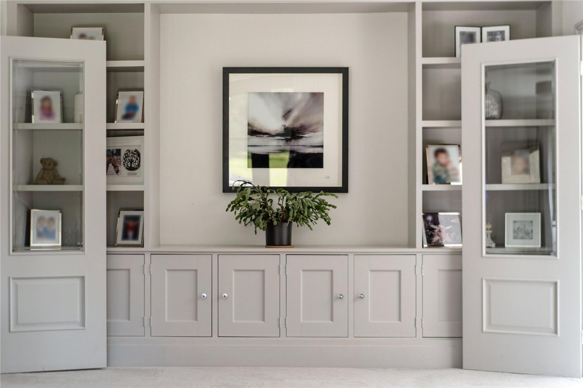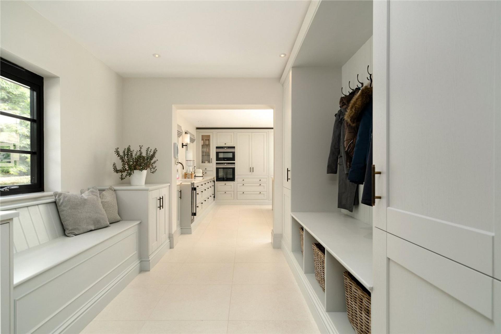 The Living Room features a newly fitted stone fireplace with a new log burner and lined flu, newly fitted carpet, French doors to the garden and a library area bespoke joinery and LED lighting. From the hallway with Amtico and underfloor heating, there is a study benefiting from both front and rear aspects. The useful boot room is accessed from the hall and features built in furniture to include basket drawers, coat hooks and a window/bench seat with storage under. Here you will also find the space and plumbing for the integrated washing machine and tumble dryer.