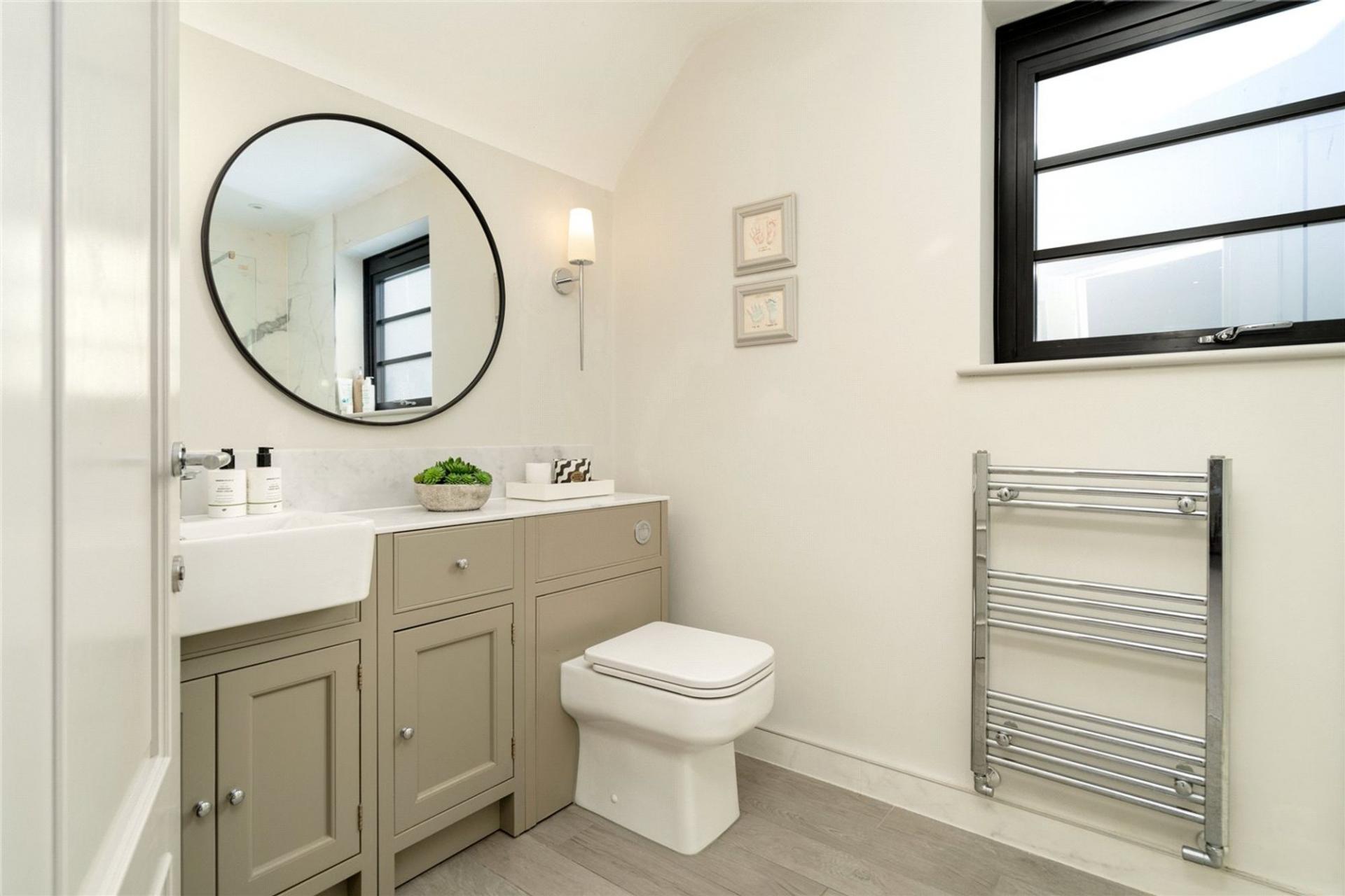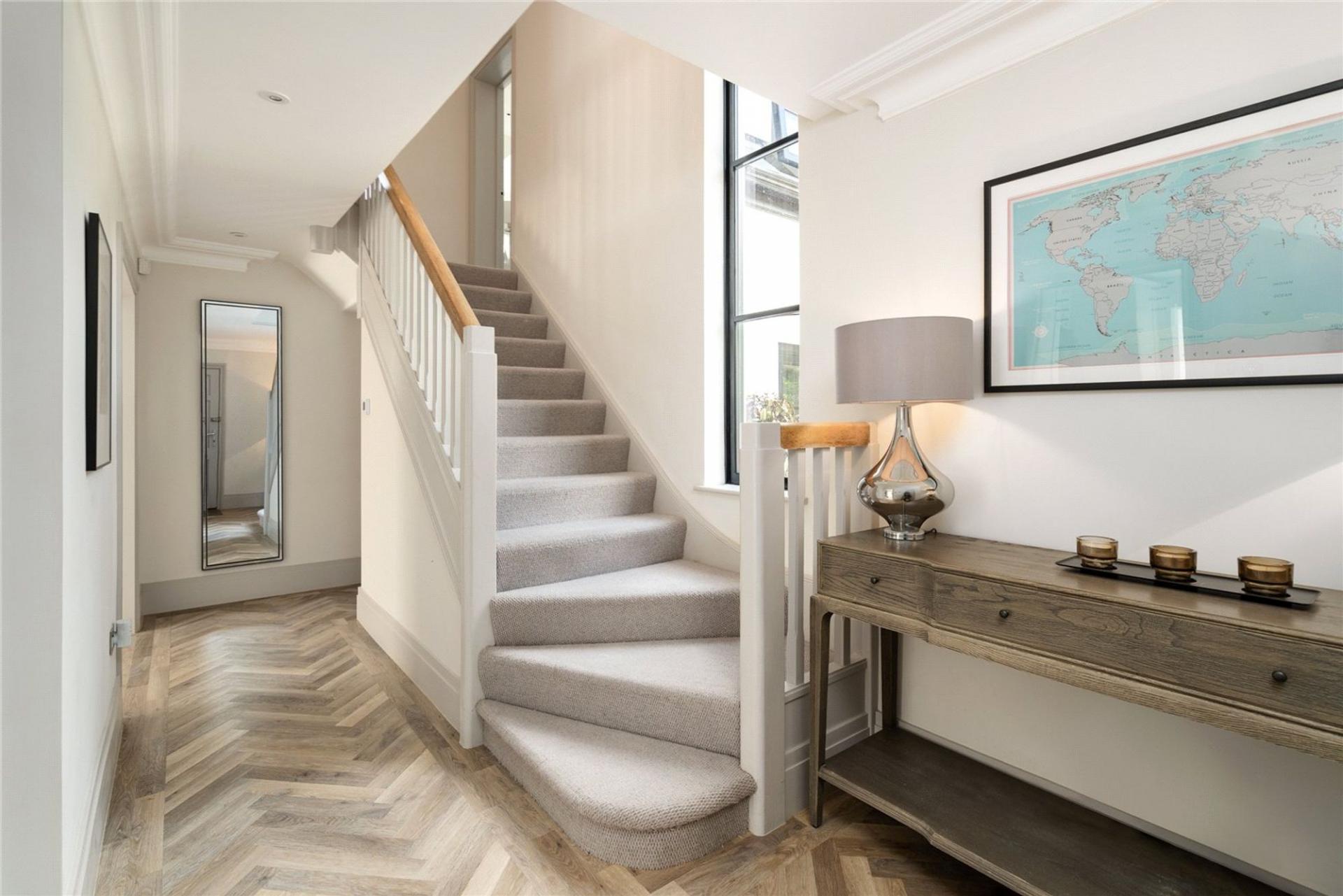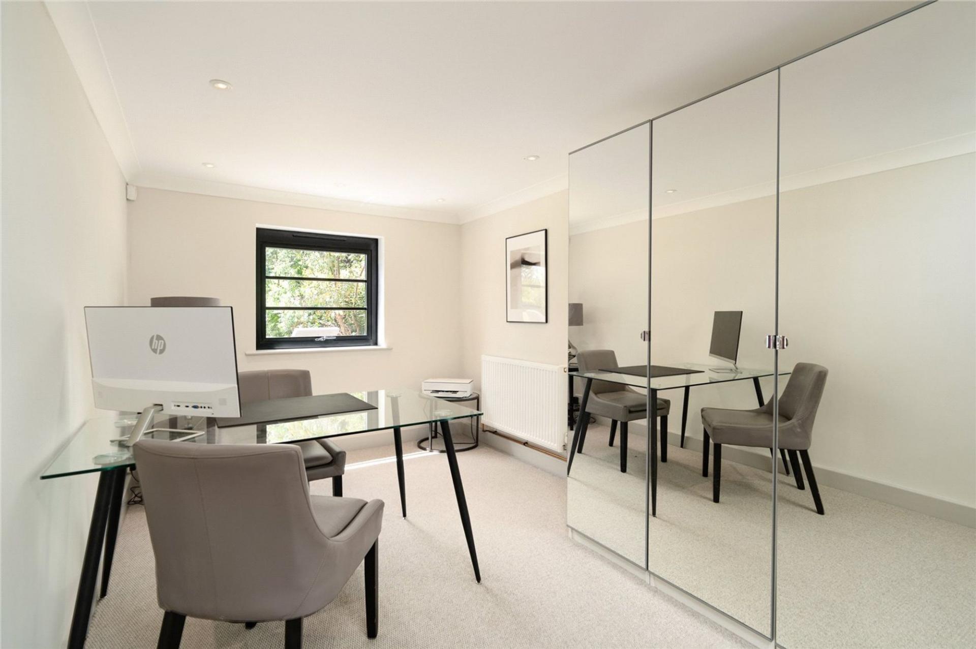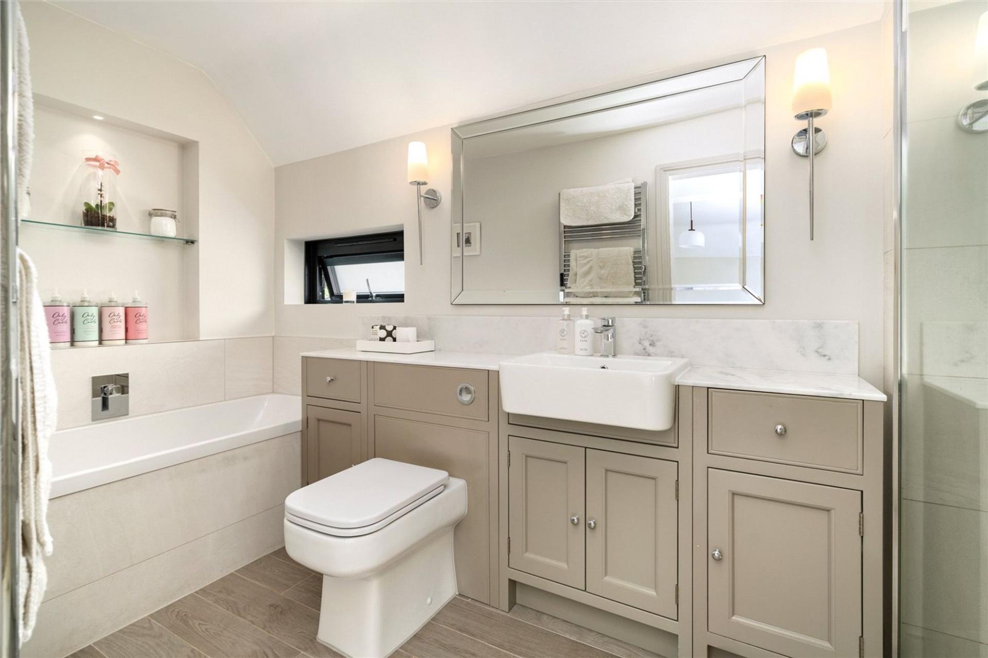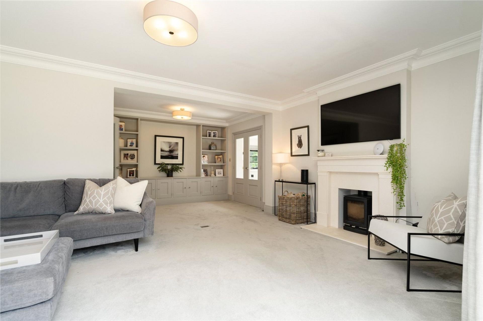 The Living Room features a newly fitted stone fireplace with a new log burner and lined flu, newly fitted carpet, French doors to the garden and a library area bespoke joinery and LED lighting. From the hallway with Amtico and underfloor heating, there is a study benefiting from both front and rear aspects. The useful boot room is accessed from the hall and features built in furniture to include basket drawers, coat hooks and a window/bench seat with storage under. Here you will also find the space and plumbing for the integrated washing machine and tumble dryer.