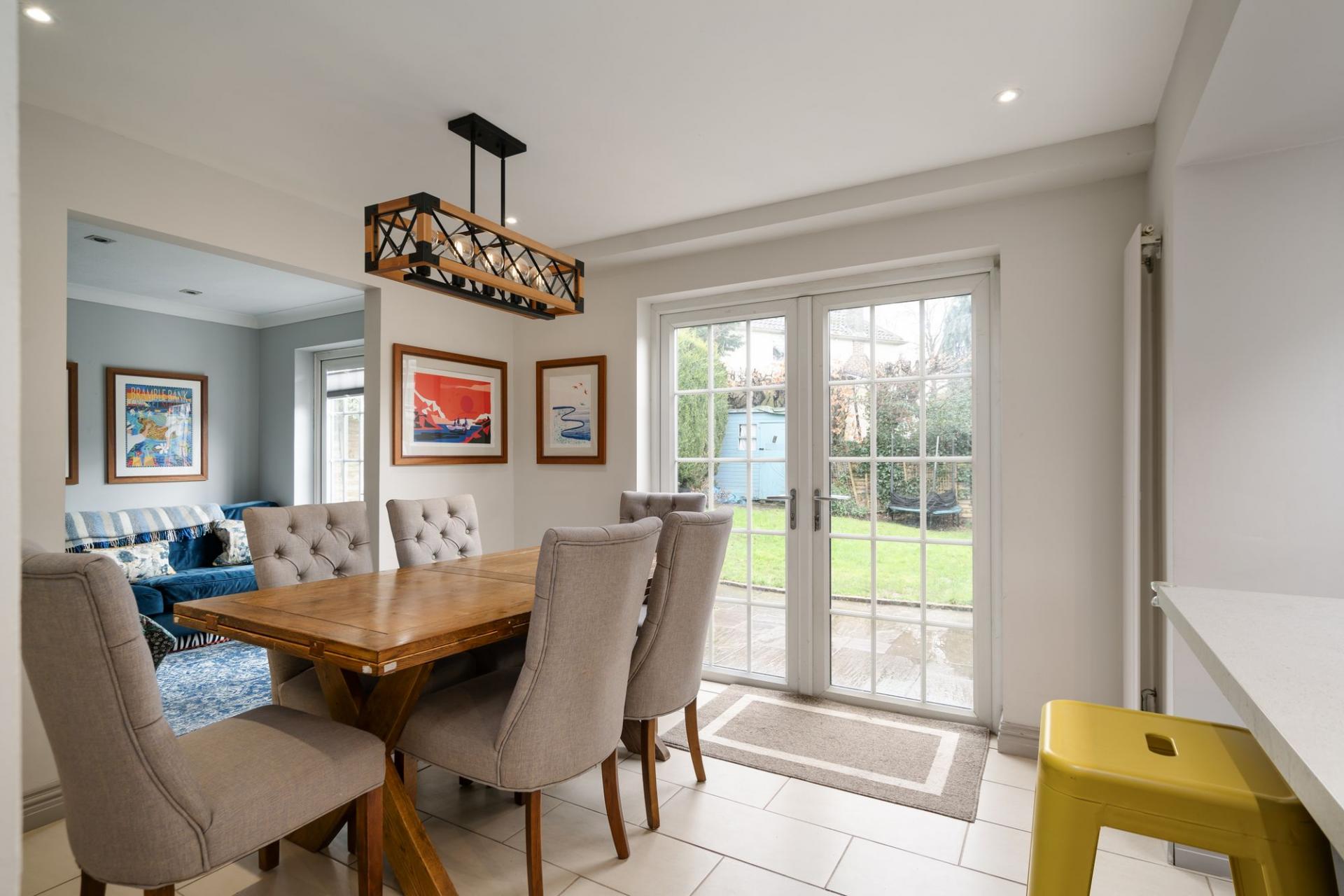 Flowing seamlessly from the open plan kitchen/ dining space is a snug creating a seamless transition between relaxation and hospitality. In addition a large lounge with new flooring looks out toward the driveway. A separate study/utility room with fitted cupboards provides a quiet room for home working.