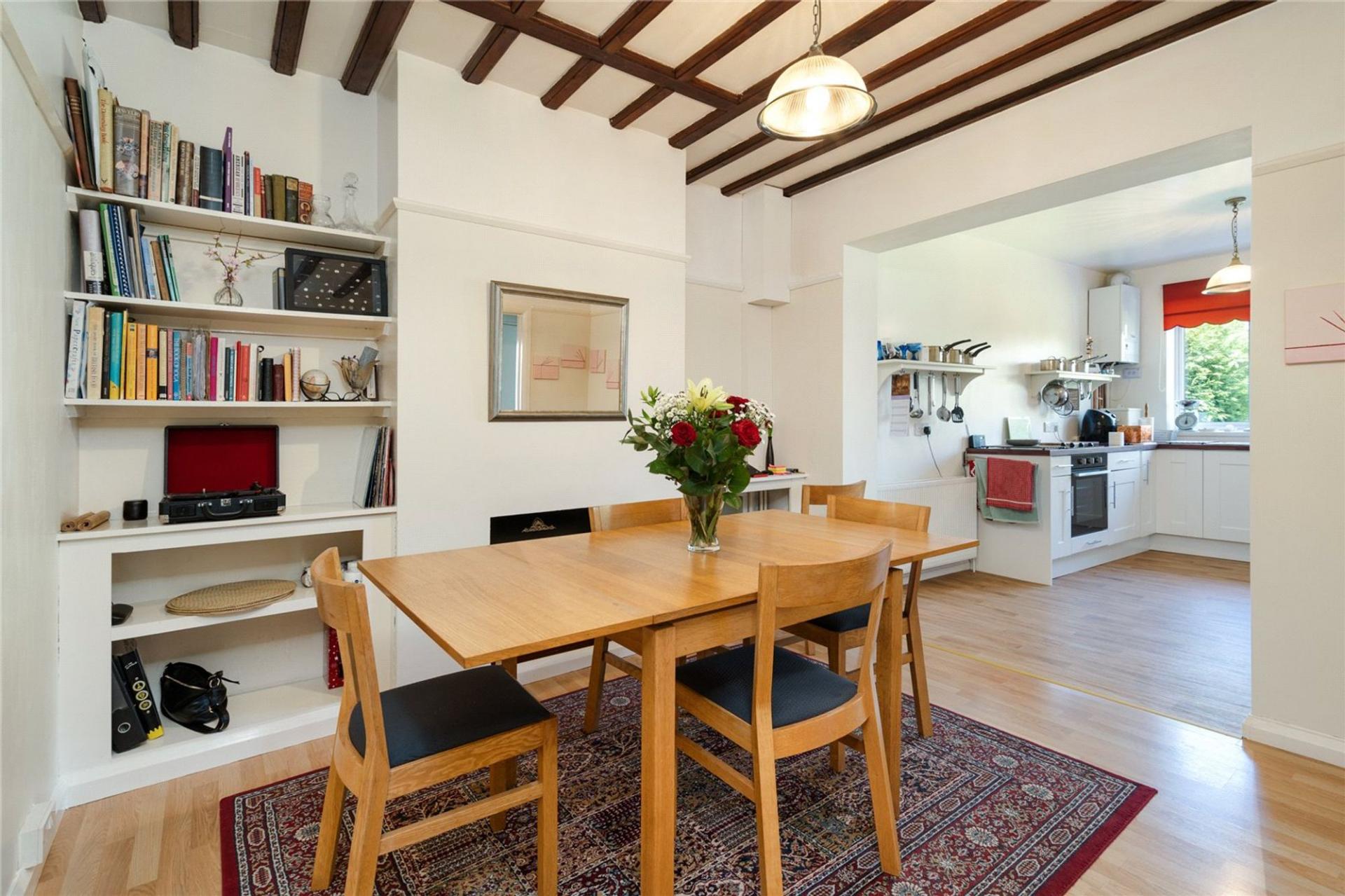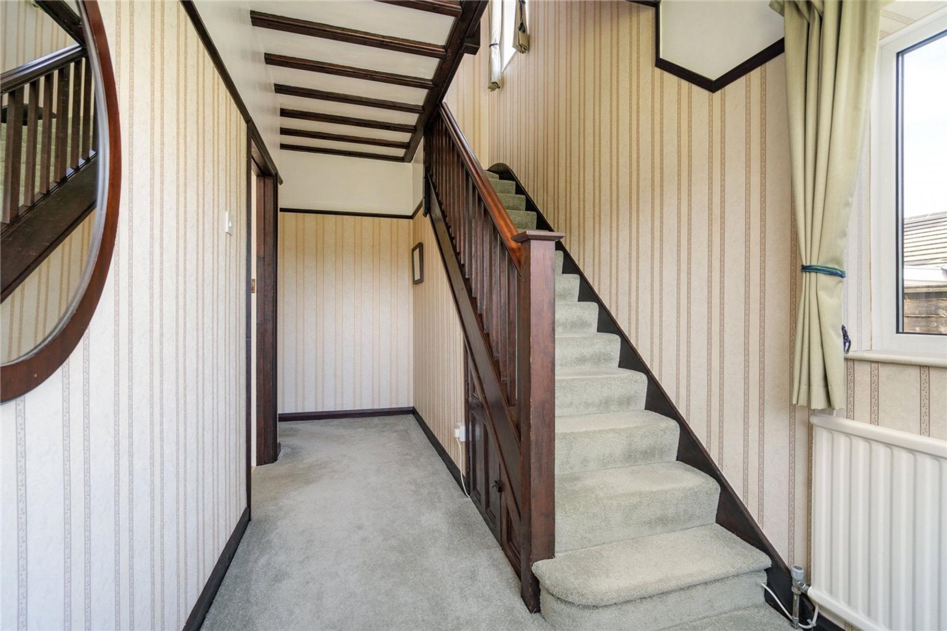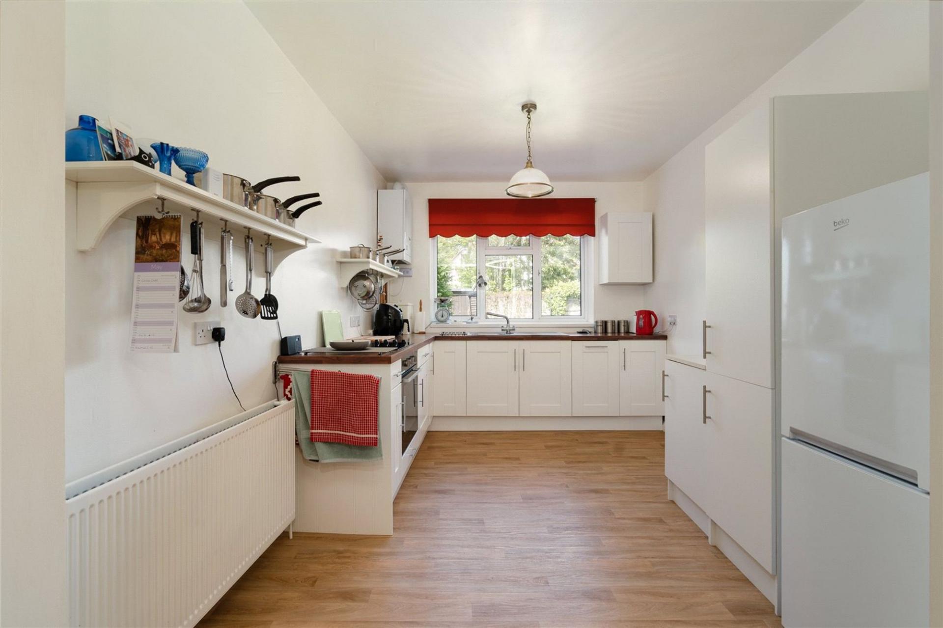 Homeleigh is approached via a long front garden, being set well back from the road and providing 2/3 off road parking spaces. The pretty front garden is well stocked with flower beds and shrubs with a pathway leading to the front door. The Lounge overlooks the front garden and has beams to the ceiling and an original fireplace surround with gas fire. The dining room has fitted shelving to each side of the fireplace, fitted with an electric fire but with the chimney still in place if an open fire is required. The kitchen is open plan to the dining room and is fitted with a range of white fronted kitchen units incorporating oven, hob, dishwasher and space for fridge/freezer. A door from the kitchen leads to a Utility Room with plumbing for washing machine and tumble dryer and with a useful downstairs cloakroom off and a door to the downstairs bedroom or family room which has doors to the rear garden. (This room is separated from the Kitchen by a stud wall, so could easily be opened up to create a larger kitchen/family room).
