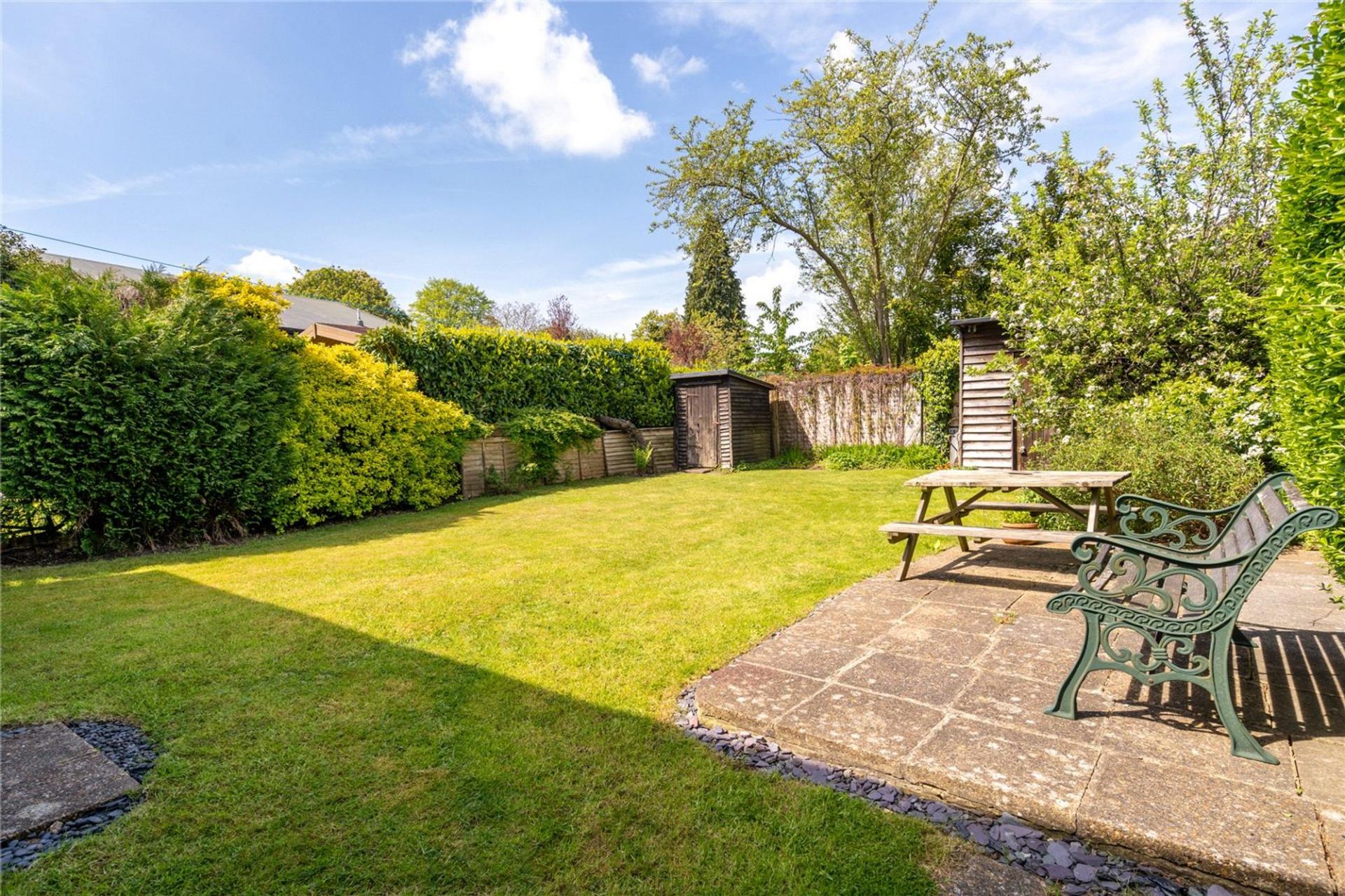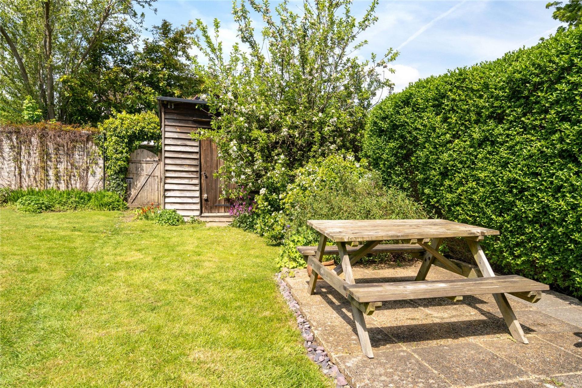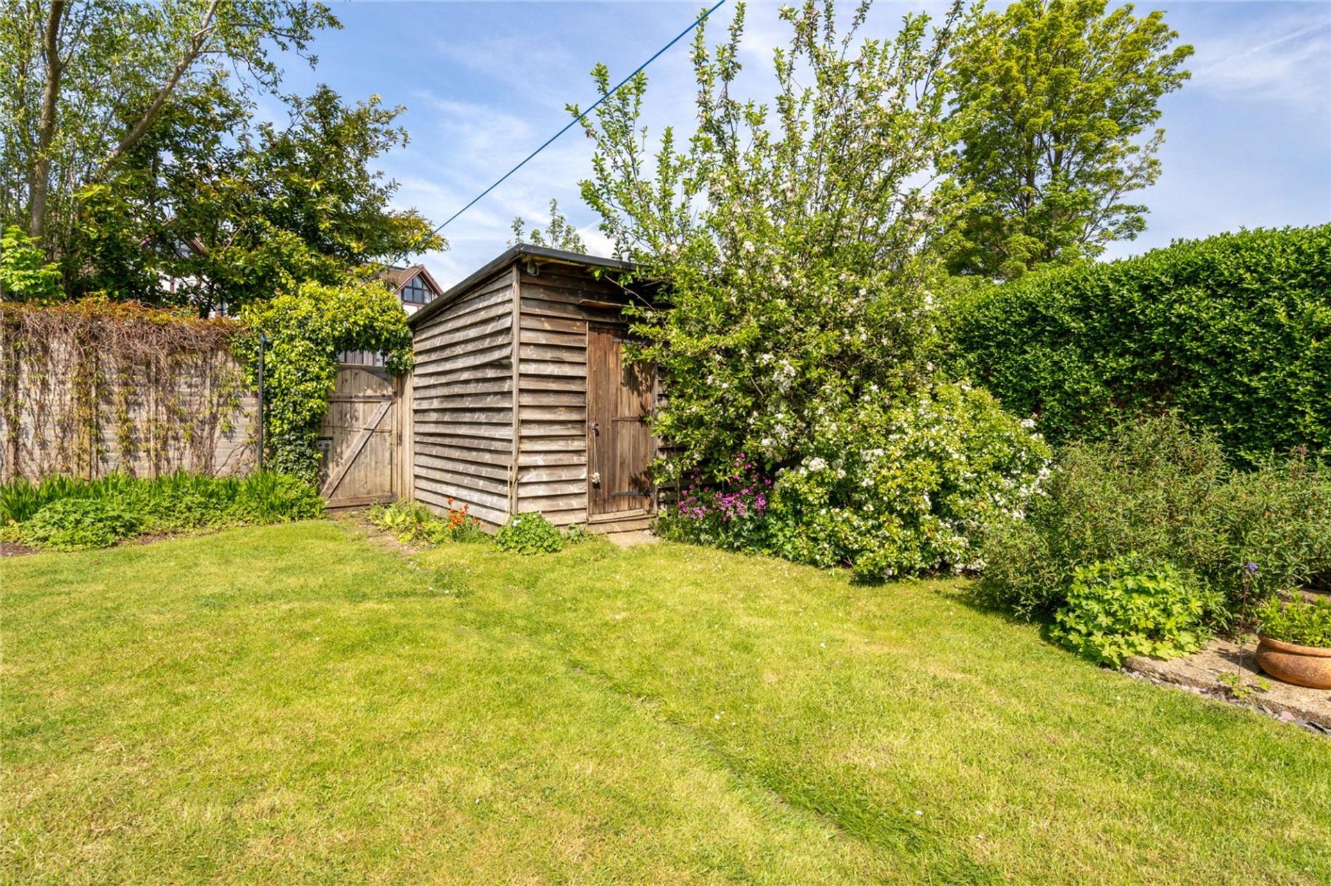 West facing rear garden with patio area, level lawn, garden shed. Covered lean-to side way providing storage with door to front garden. The front garden is large in size with mature shrubs and beds with 2/3 off road parking spaces.