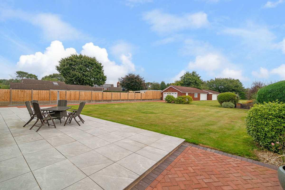 The property's design includes high-quality finishes and fixtures throughout, ensuring a sophisticated living experience. Outside, the rear garden offers a private and serene space, ideal for outdoor activities or simply enjoying the peaceful surroundings. There is also a large outbuilding currently used as a quadruple garage and storage.