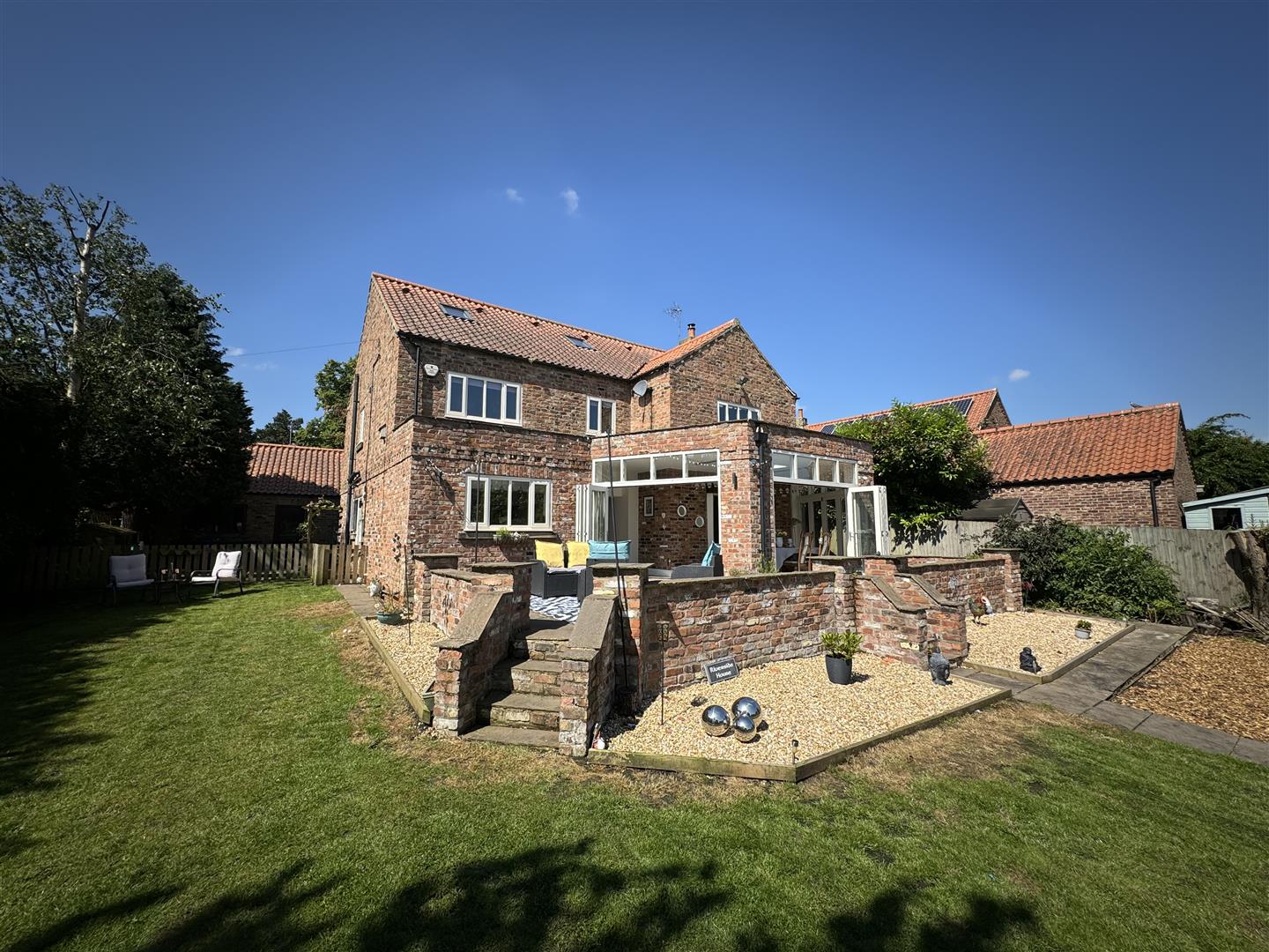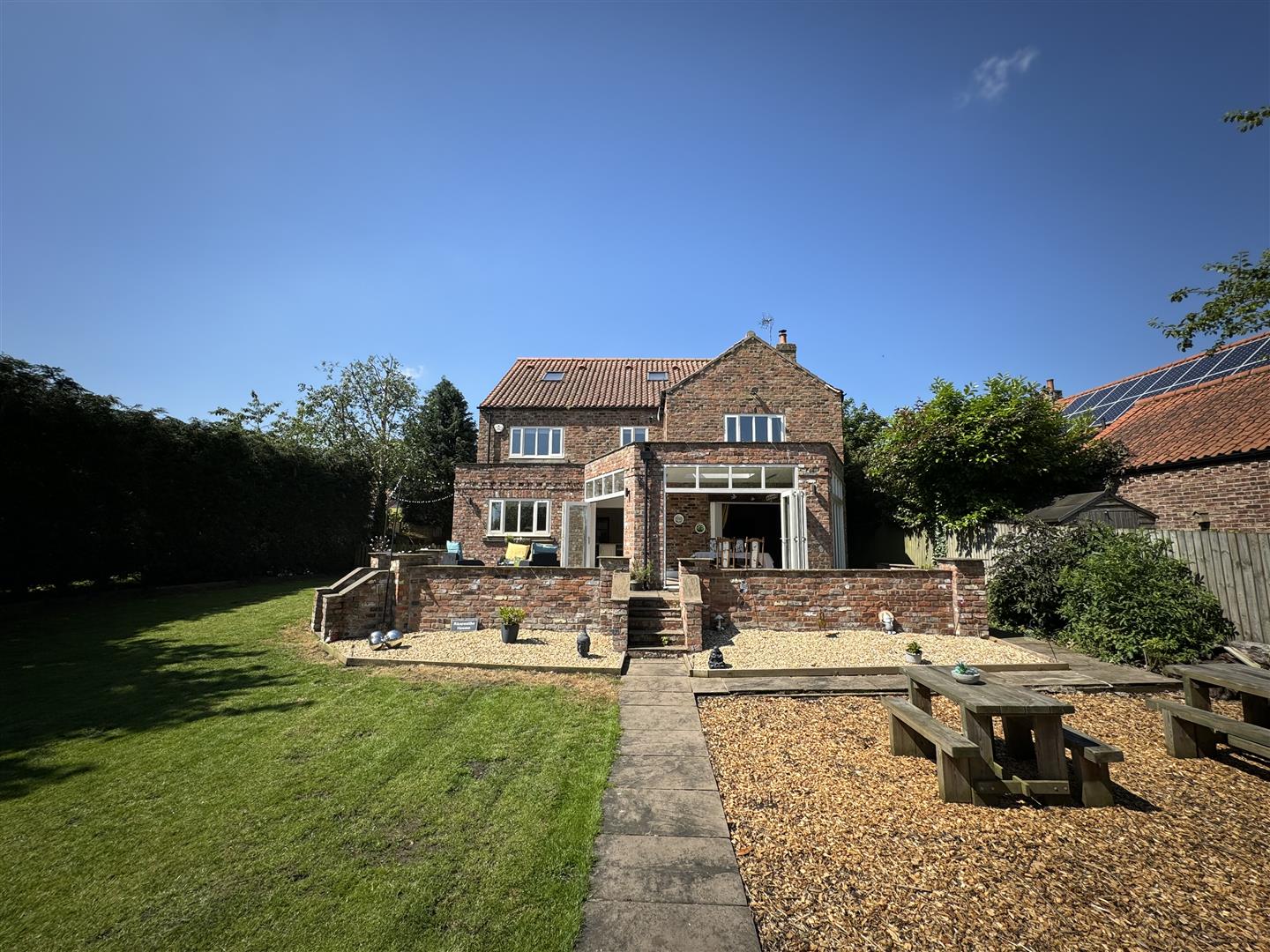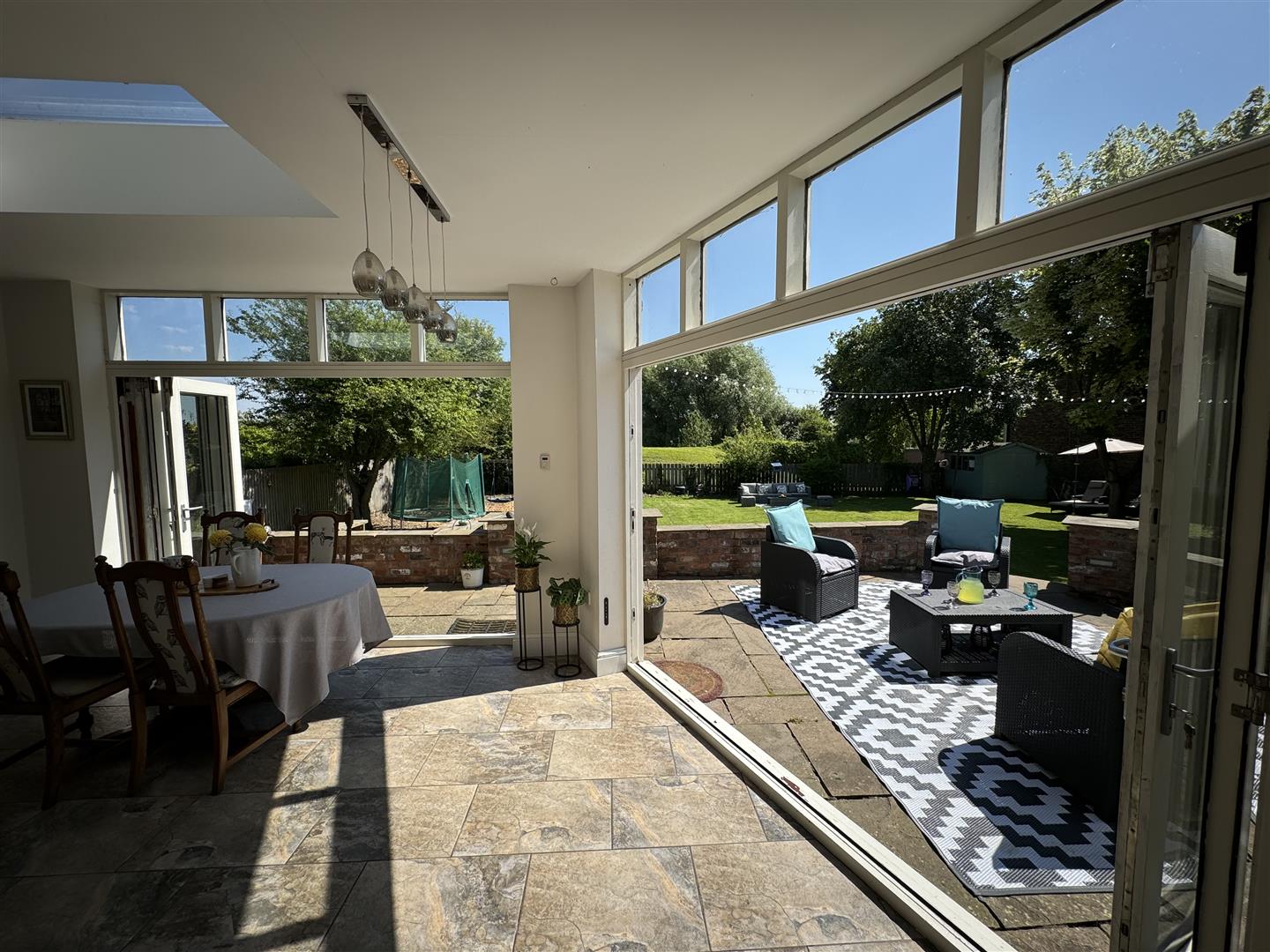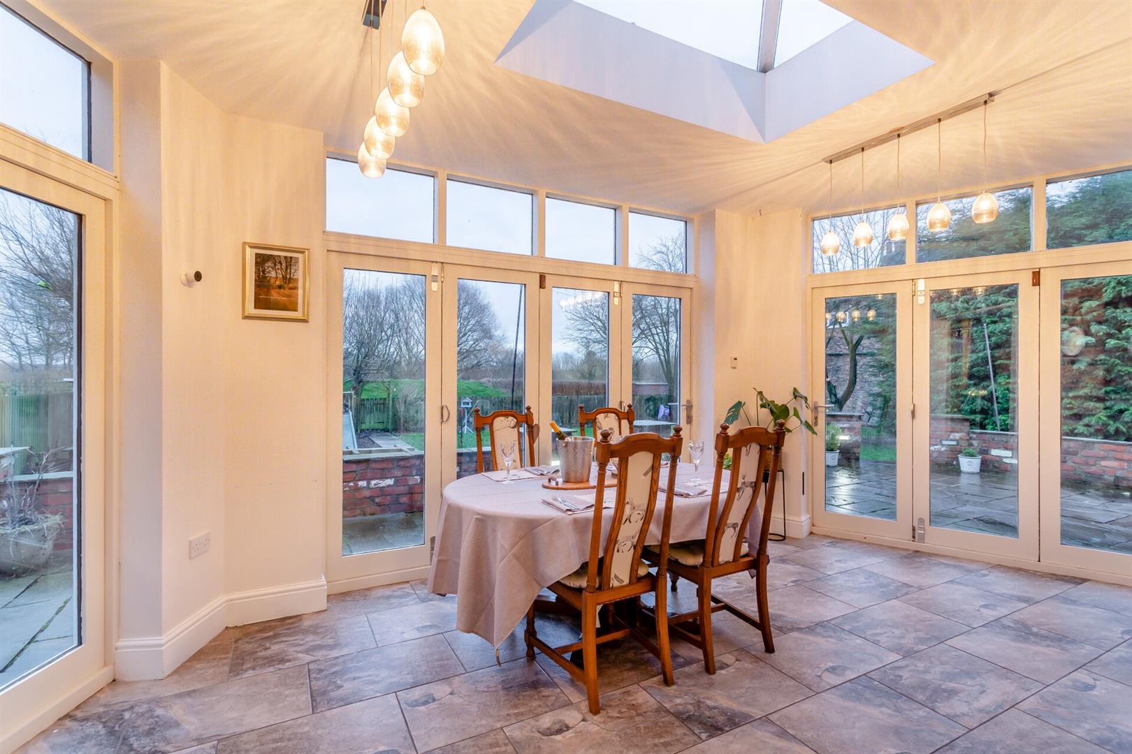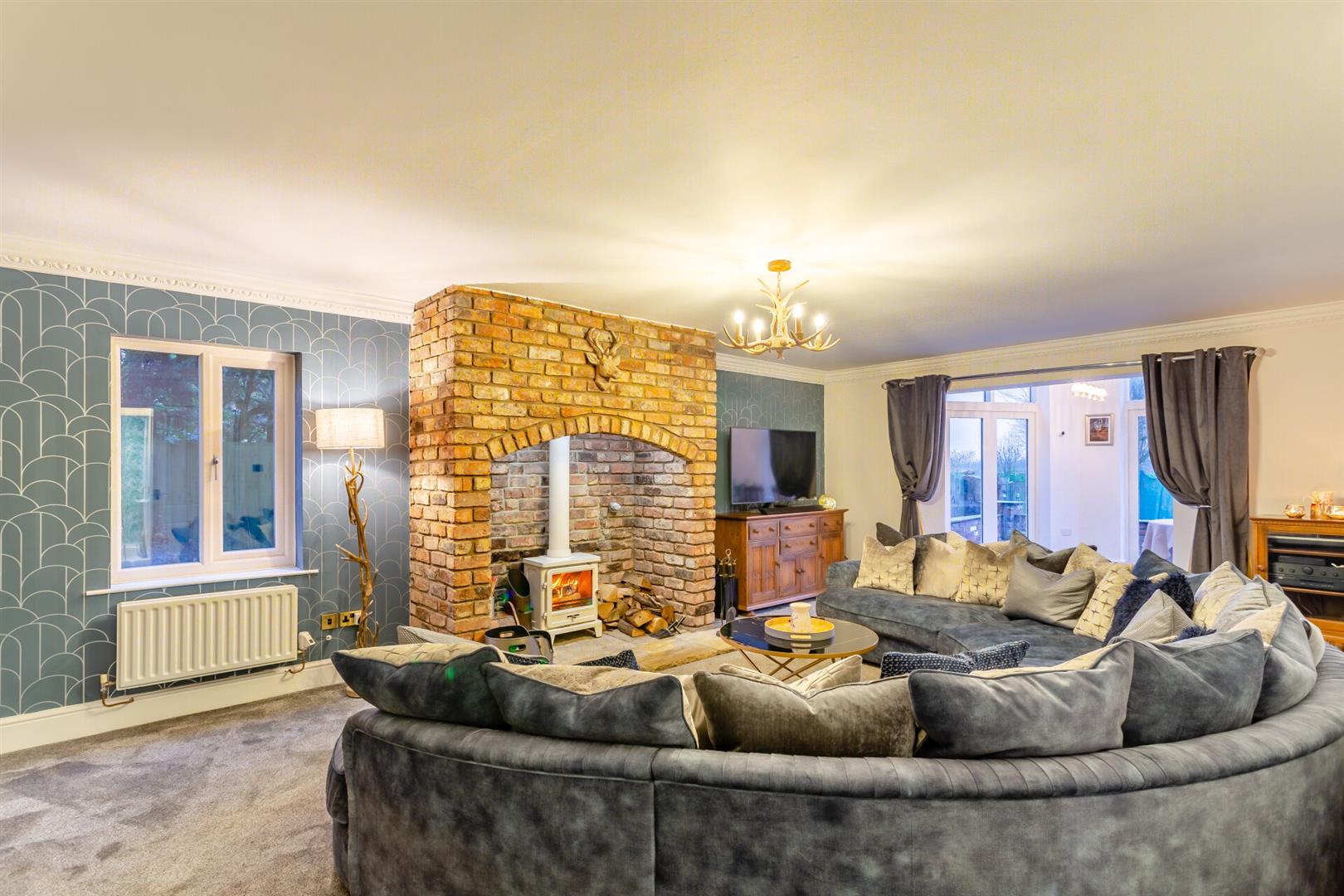 Entertain with flair in the expansive lounge, featuring a charming brick-built fireplace and solid fuel fire, or host elegant gatherings in the spacious dining room which opens up onto the patio and garden through two sets of tri-fold doors.