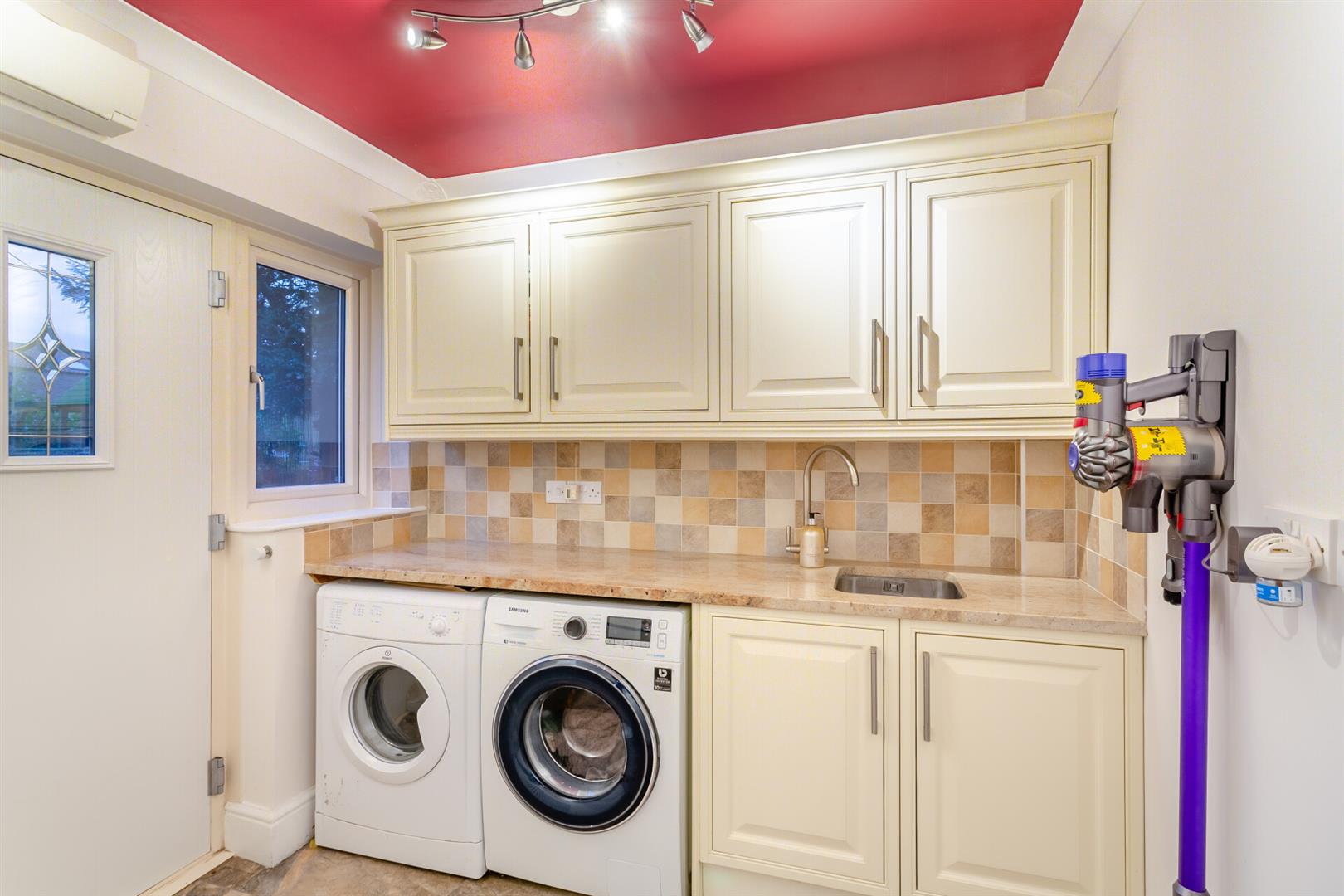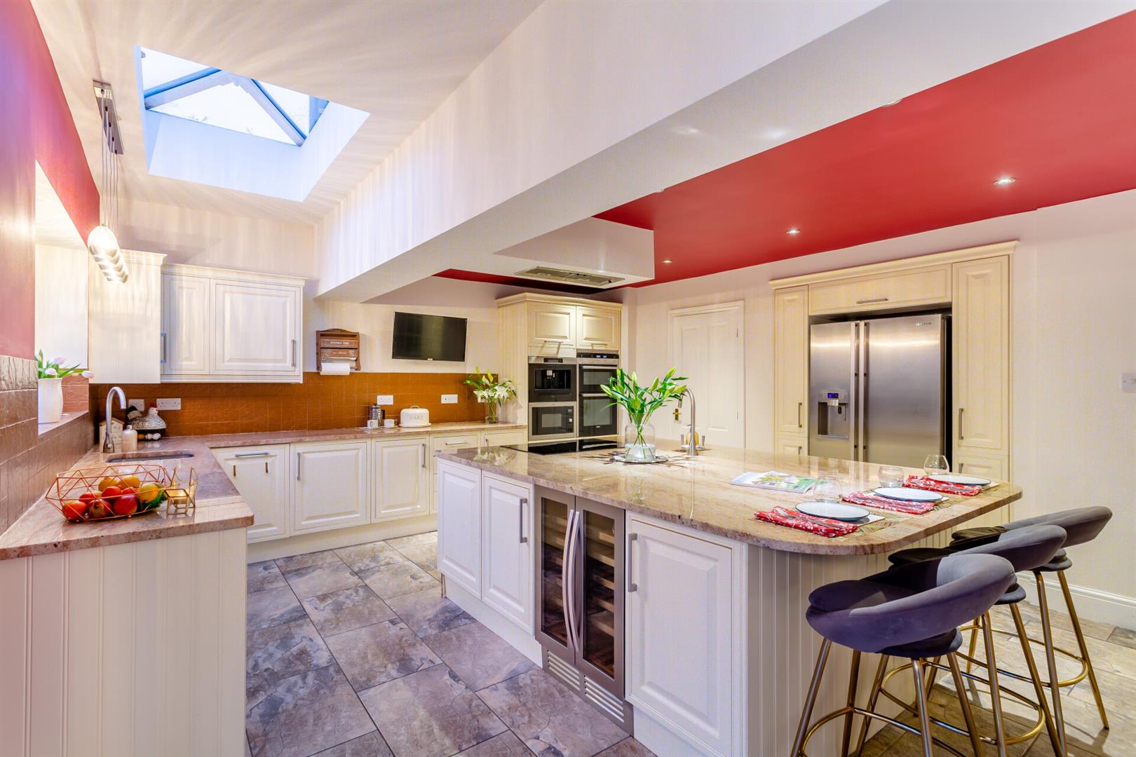 The modern kitchen is adorned with high-end appliances including a coffee machine, double oven, microwave , double wine fridge, dishwasher and induction hob. The high-end granite countertops are complemented by a large feature island, perfect for family life and entertaining. The kitchen seamlessly connects to a fitted utility room for added convenience in daily tasks.